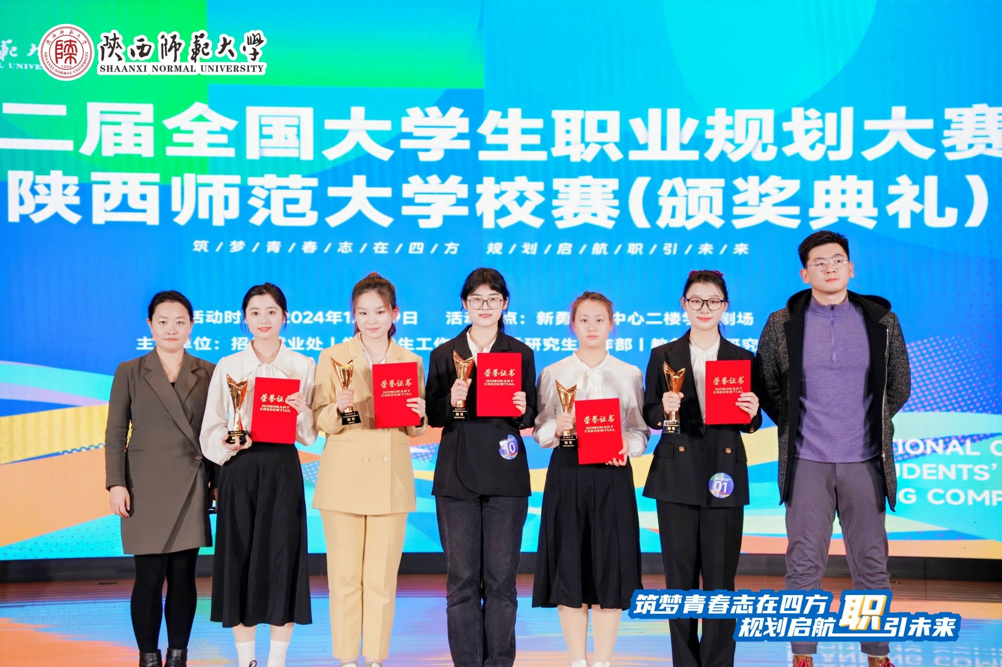 2021级本科生金新宸、田雨欣分别获就业赛道本科生组金奖、银奖,2023级硕士研究生王媛获就业赛道研究生组银奖,2022级本科生朱欣悦获成长赛道铜奖,辅导员邓文珺获“优秀指导教师”荣誉称号,学院获“优秀组织单位”荣誉称号。