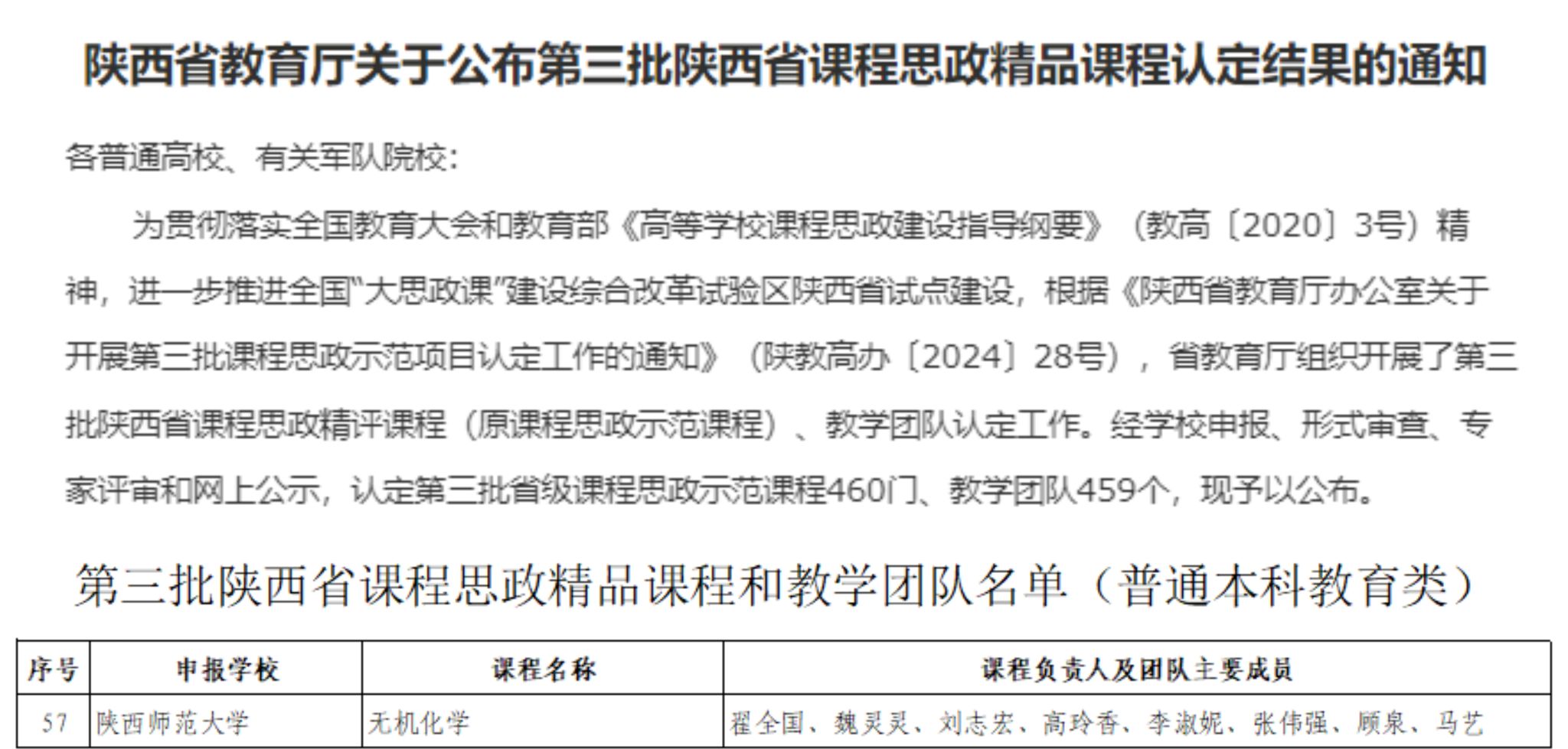 近日,陕西省教育厅发布了《陕西省教育厅关于公布第三批陕西省课程思政精品课程认定结果的通知》,蘑菇视频 翟全国教授主持的《无机化学》课程成功入选,该课程教学团队同时被认定为陕西省课程思政教学团队。