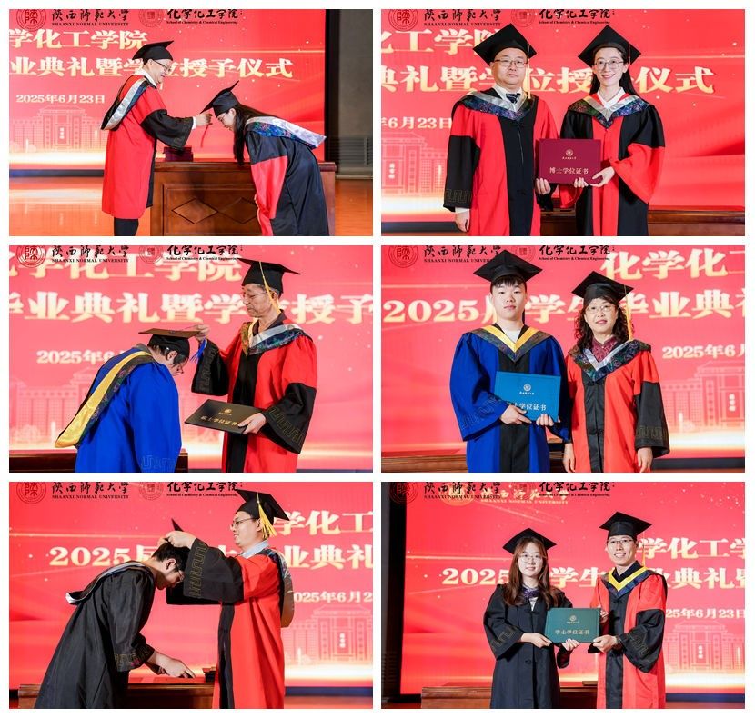 2025届博士毕业生代表李京晟和本科毕业生代表李文梓发言。他们表示将秉承学校“西部红烛两代师表”精神,牢记学院“包容、务实、创新、精进”使命,在各自岗位上发光发热,书写陕师大化学人的时代华章。