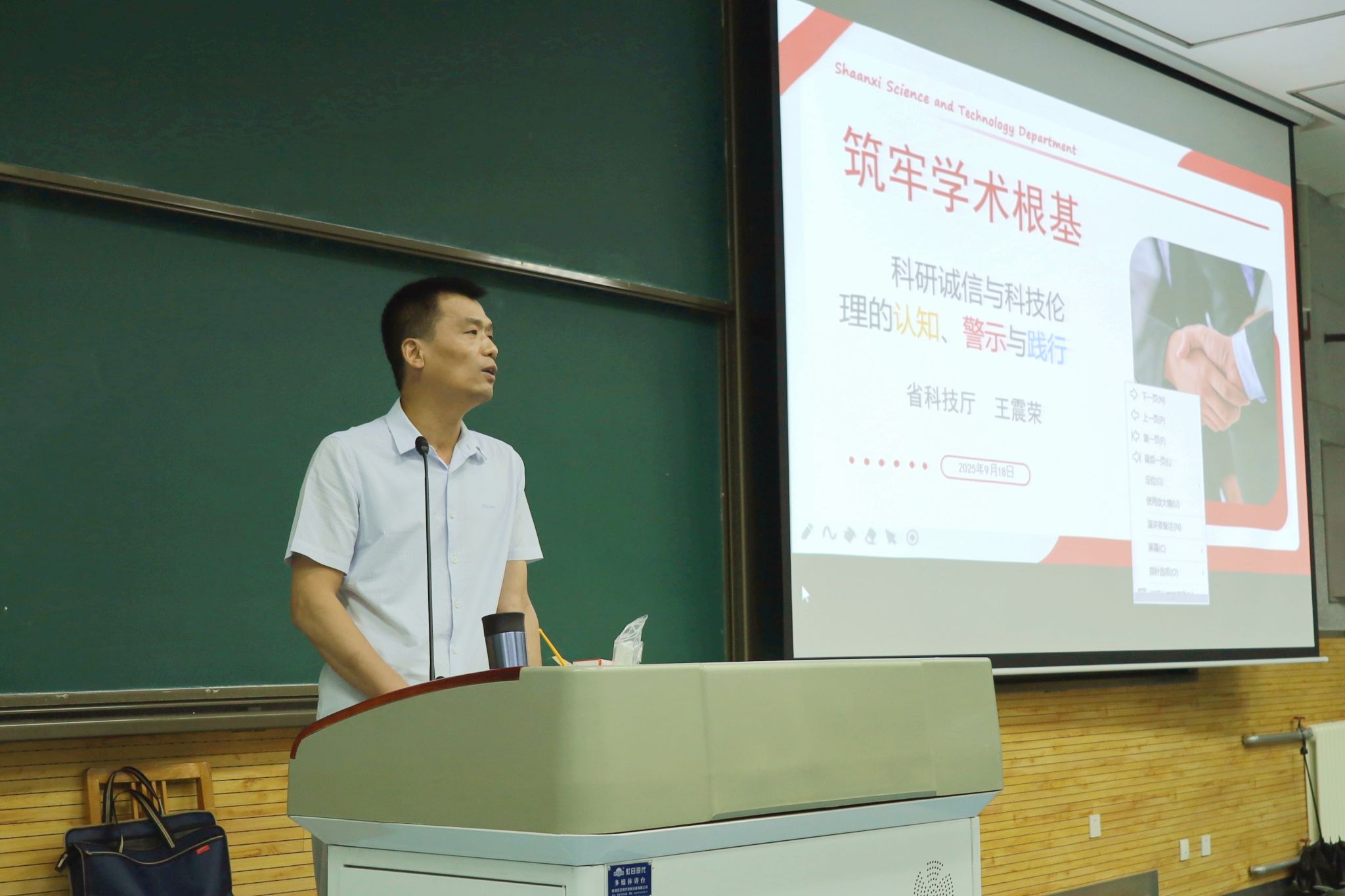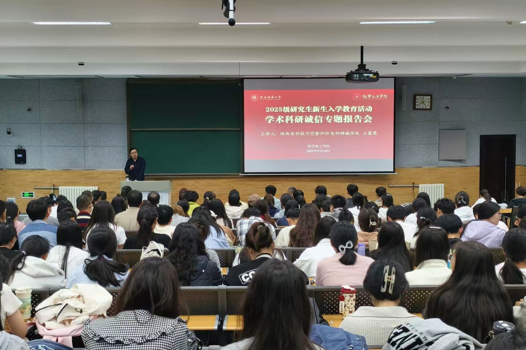 于长安校区文渊楼4202教室举办2025级研究生新生入学教育活动之学术科研诚信专题报告会。本次报告特邀陕西省科技厅监督评估与科研诚信处处长王震荣主讲,学院院长刘成辉、党委副书记贾颍辉、副院长肖新军,以及2025级研究生辅导员和全体研究生新生共同听报告。报告会由刘成辉主持。