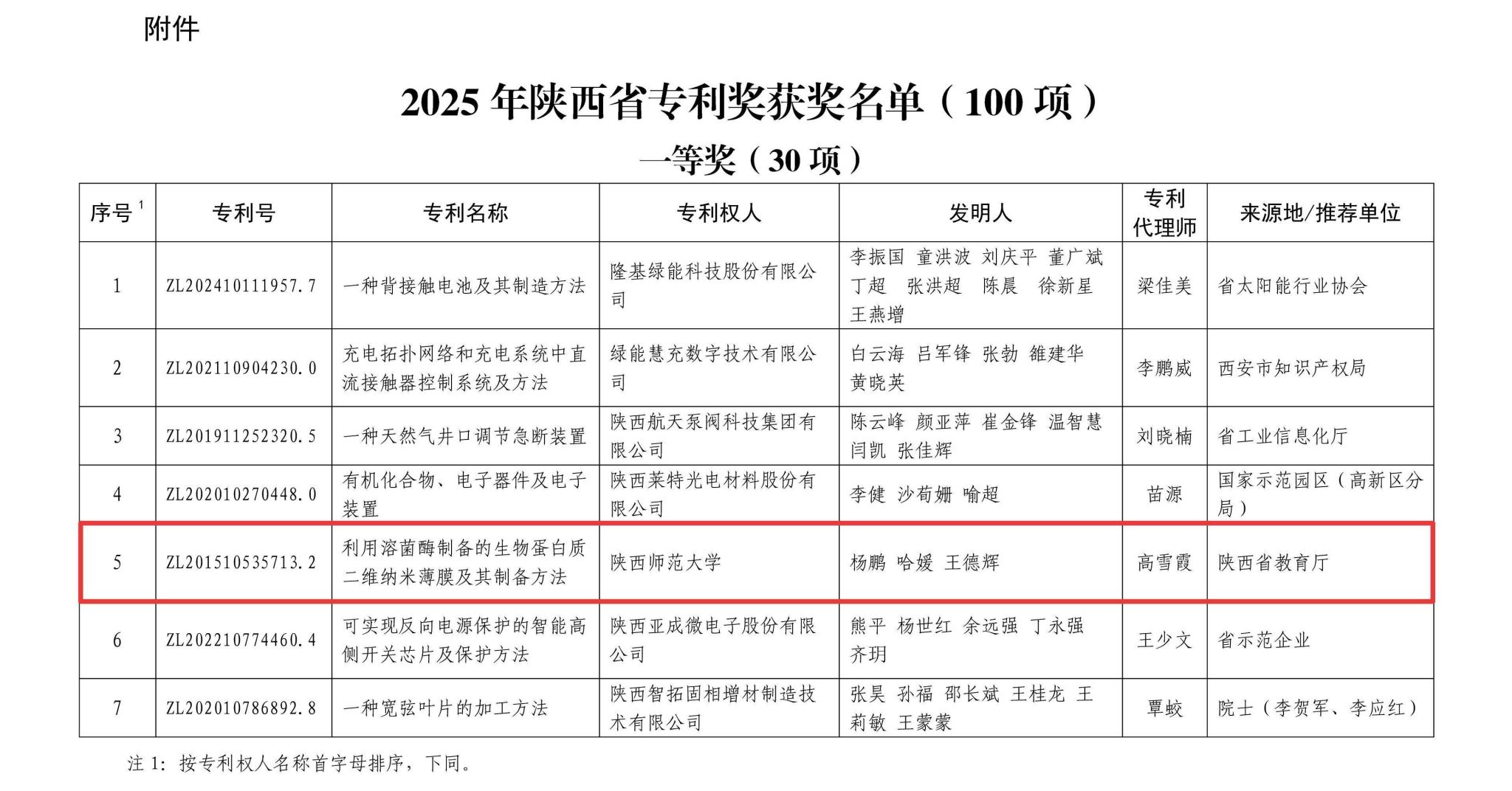 近日,陕西省人力资源和社会保障厅、陕西省知识产权局发布《关于表彰2025年陕西省专利奖的决定》,蘑菇视频 杨鹏教授团队的专利《利用溶菌酶制备的生物蛋白质二维纳米薄膜及其制备方法》获评陕西省专利奖一等奖,实现了蘑菇视频 在知识产权领域的新突破。