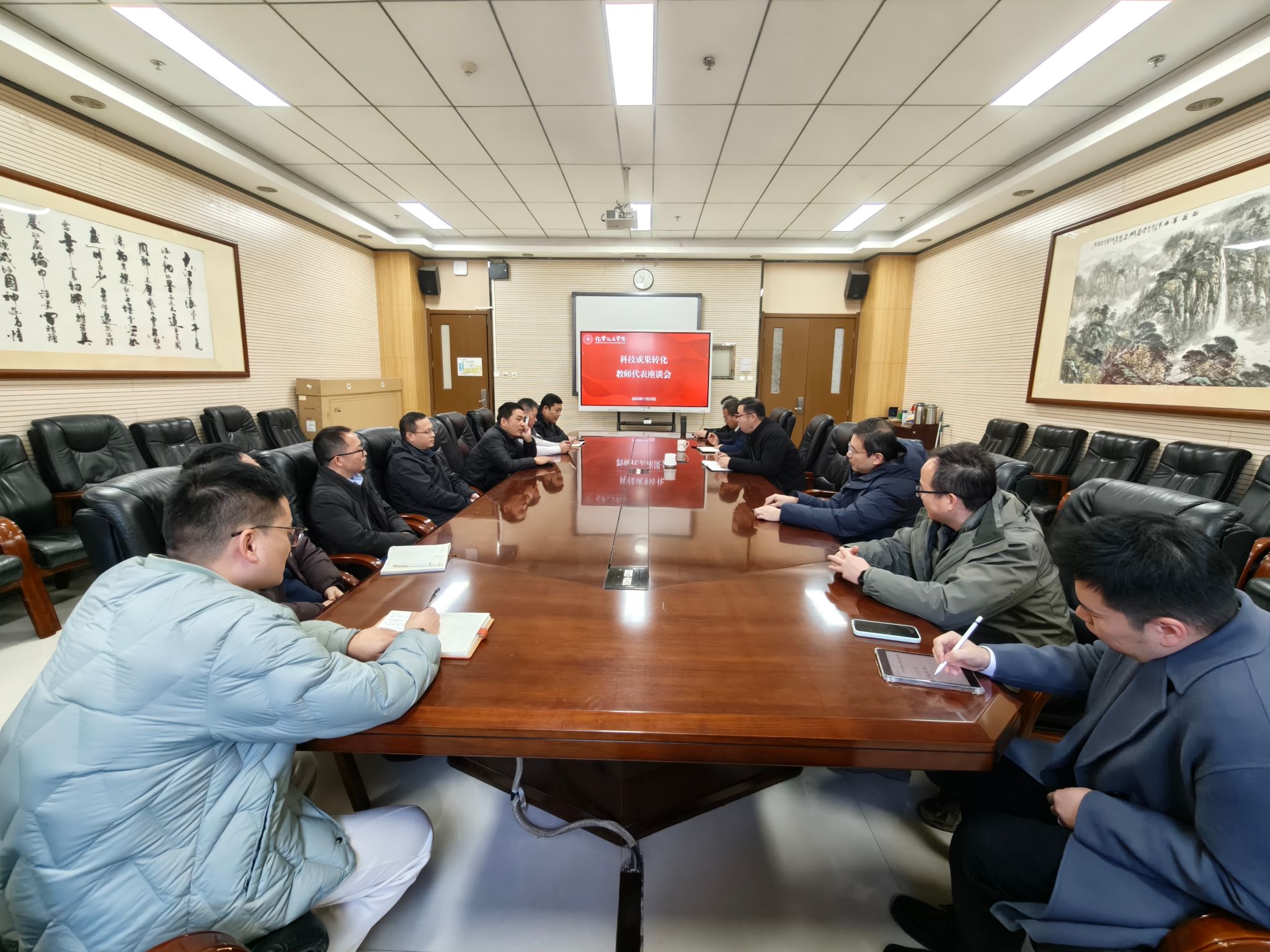 在致知楼1362会议室召开科技成果转化推进工作教师座谈会。院长刘成辉、副院长肖新军、多位在科研成果转化方面取得突出成绩的教师代表、学院党政办公室主任张伟、科研秘书冯秦雅参加座谈。