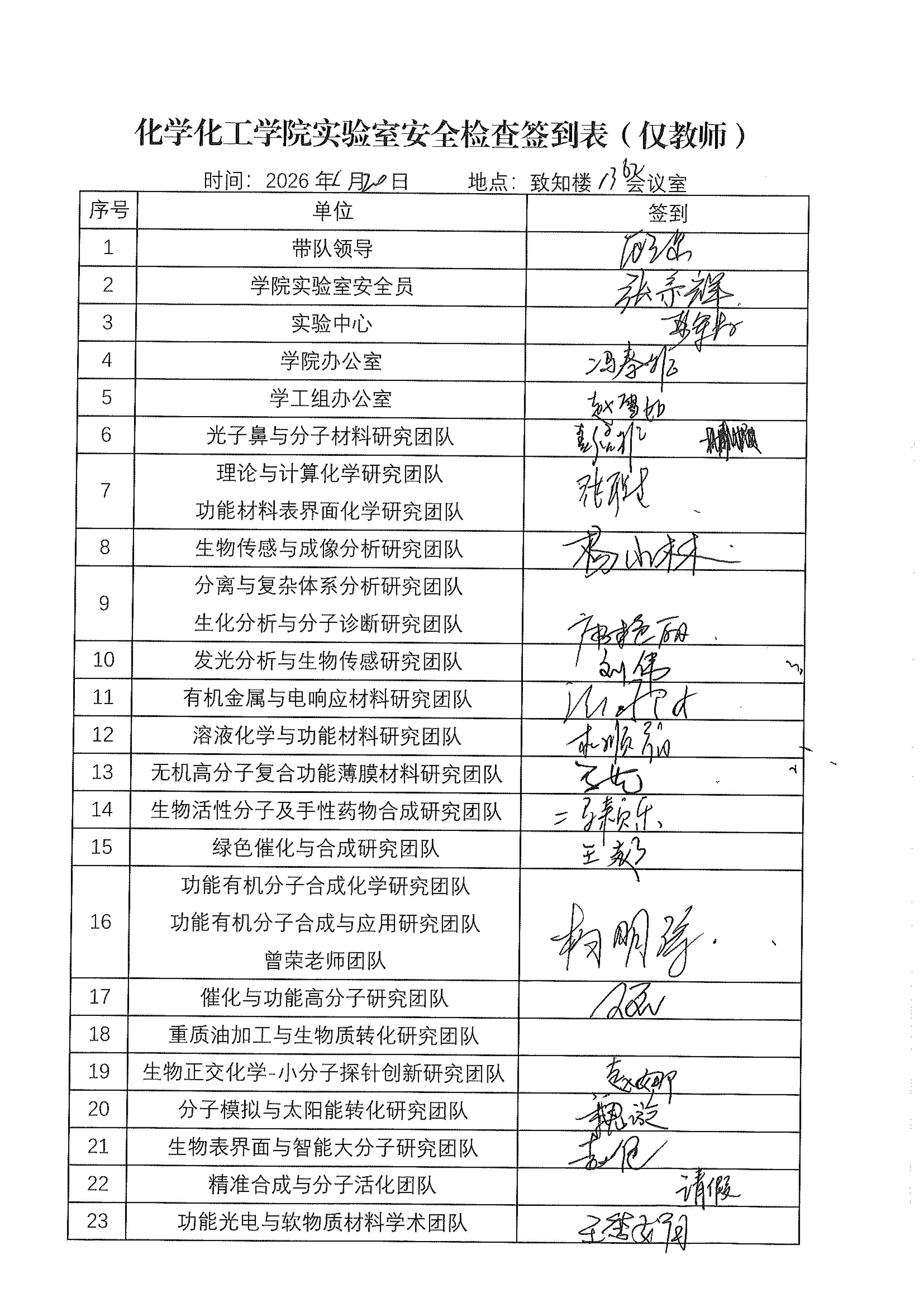 1月20日下午,学院组织了1月份实验室安全检查工作。学院副院长顾泉,应用表面与胶体化学教育部重点实验室副主任严军林、各科研团队教师代表和学生代表约40余人参加本次安全检查工作。