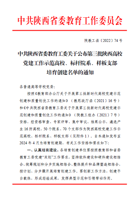 近日,中共陕西省委教育工委下发了《关于公布第三批陕西高校党建工作示范高校、标杆院系、样板支部培育创建名单的通知》(陕教工函〔2022〕74号)。蘑菇视频
