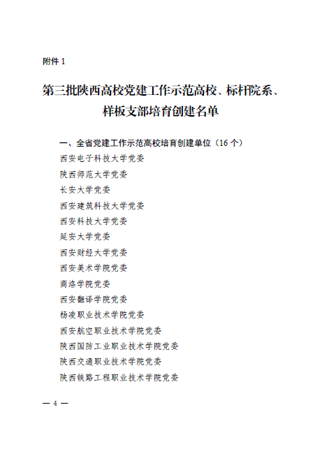 第三批全省党建工作标杆院系、样板支部培育创建单位面向全省高校党委和党支部公开遴选。经资格审查、专家评审、集中审议、结果公示,最终遴选产生16所高校、50个院系、70个支部作为陕西高校党建工作示范高校、标杆院系、样板支部,进行为期2年的创建培育工作。
