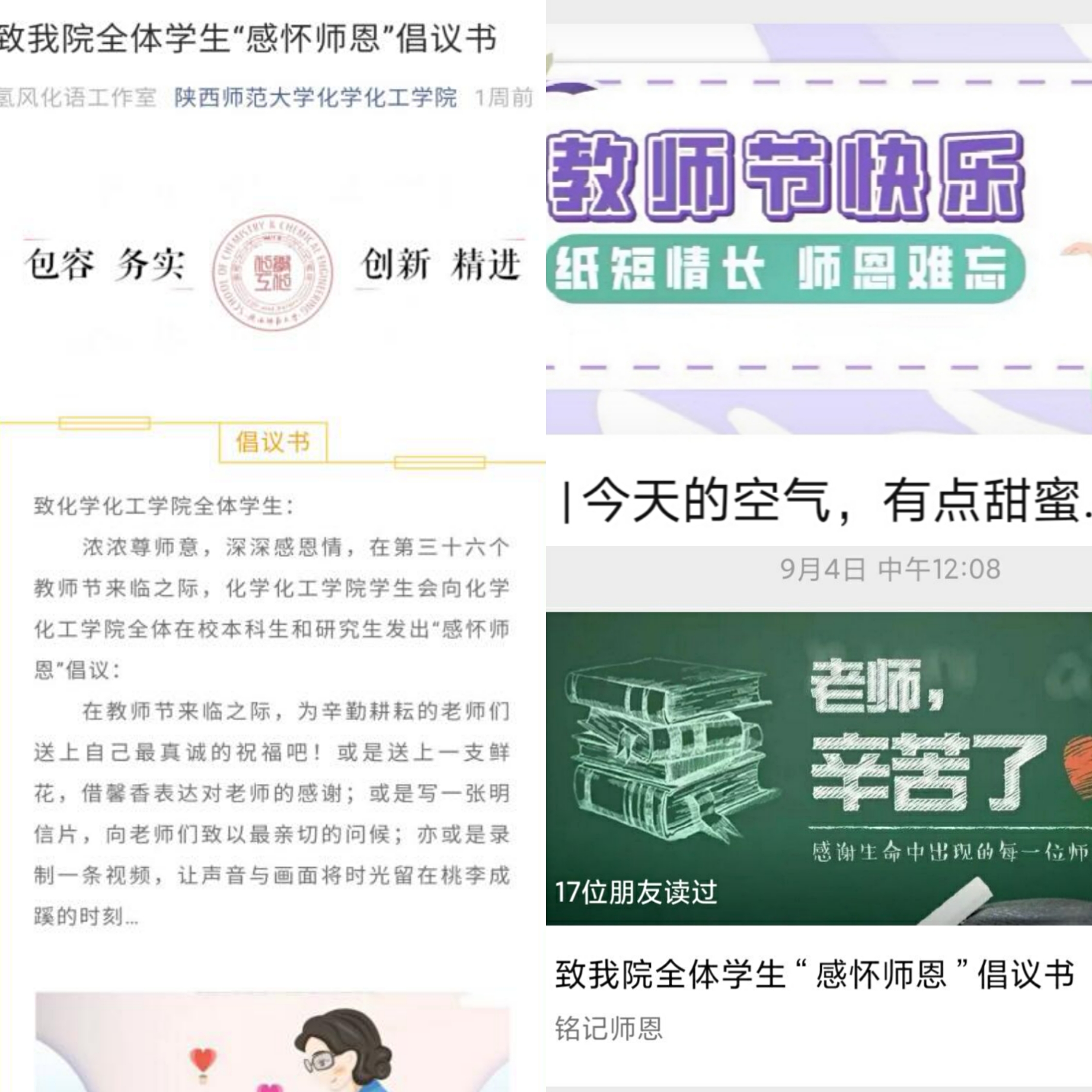 学生会向全体在校本科生和研究生发出“感怀师恩”倡议,呼吁同学们采取灵活多样的方式向老师表达感谢。