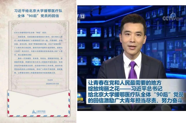 3月15日,中共中央总书记、国家主席、中央军委主席习近平给北京大学援鄂医疗队“90后”党员回信,向他们和奋斗在疫情防控各条战线上的广大青年致以诚挚的问候,勉励广大青年不惧风雨、勇挑重担,让青春在党和人民最需要的地方绽放绚丽之花。蘑菇视频