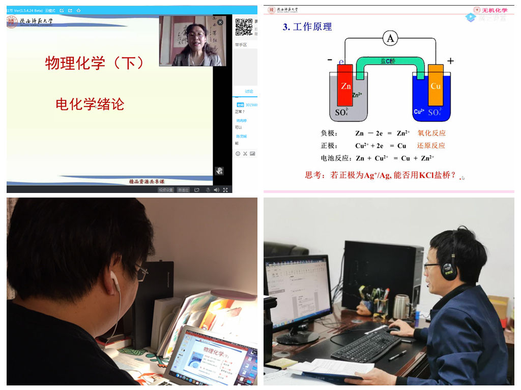 化学教学论教研组的老师们以“网上音像”的形式,利用互联网和信息化教育资源帮助学生们“宅”在家就能上课,真正做到了“离校不离教、停课不停学”。老师们运用线上教育等方式,妥善安排好开课前各项教育教学工作。制定了“防疫期间线上学习的教学设计方案”,以线上直播为主,师生互动、生生互动为辅开启了本学期的本科教学工作。教学直播结束后通过作业线上提交、平台答疑交流的方式与学生保持积极互动。“停课不停学”不是单纯的上网课,学生可以把不同的教学资源当做学习的路径,采取线上资源+线下课本等相结合的方式开展学习。这样不仅可以有效地缓解学生的疲劳感,对缺乏移动终端学习设备的学生来说也同样具有可操作性。线上学习变化的是学习环境、学习方式,不变的是教育立德树人的初心和使命;疫情挡住的是老师与学生的空间距离,挡不住的是同学们学习的热情。