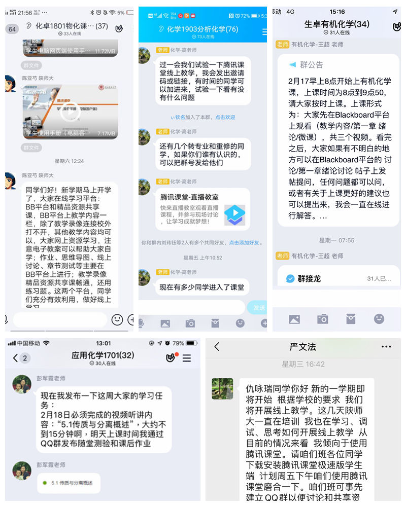 教师充分利用国内各种线上教学资源,依托各类在线课程平台和网络学习空间,积极准备自建或选用校内外相关优质在线课程开展形式多样的线上教学活动,并与上课学生完成对接和课程演练,以保证课程的顺利进行。开学第一天,16门线上课程如期开课。第二天,18门线上课程进展顺利。学院教师依托超星学习通、学堂在线雨课堂、腾讯课堂、中国大学MOOC、Blackboard平台以及QQ、微信等网络平台,通过在线直播、视频演示、互动交流等方式开展了线上授课。2月17日课程开始后,学院领导直接进入多个课程群检查教学情况,以上举措充分保证了教学工作的顺利进行。