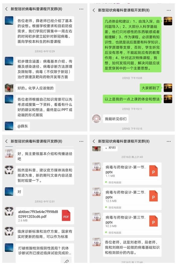 承担通识教育公选课的教师在开学前也投入了大量时间,进行了积极认真的准备。以薛东教授负责,蒋育澄、张琦等教师共同承担的《化学与社会进步》课程克服了选课人数多、学生来源复杂等困难的直播教学于周一晚在云端与学生们相遇,针对疫情课程绪论部分新增了针对2019新型冠状病毒(2019-nCoV)的专集,引导学生科学看待和认识本次疫情,重新认识化学。