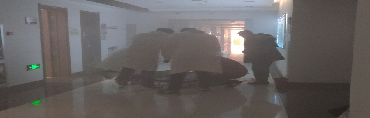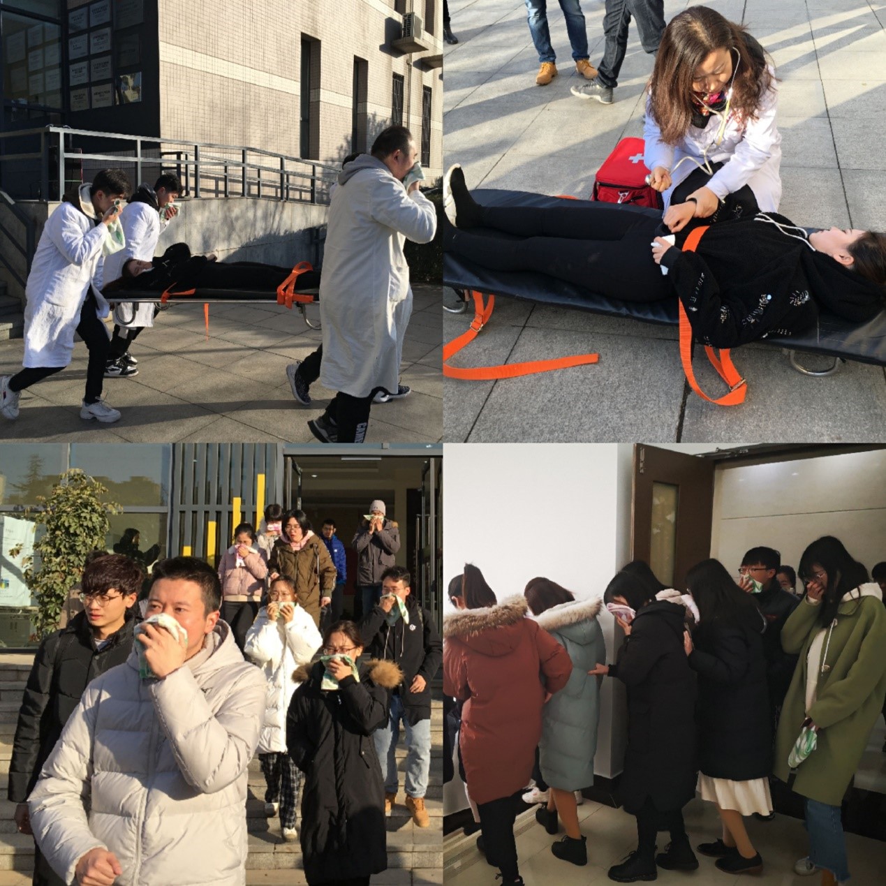 9时15分,伴随着警报信号响起,应急疏散环节迅即展开,各应急小组按照统一领导、综合协调、分级负责的应急处置原则,在肖新军的指挥下,迅速到达各自岗位,对照事故的发现与报告、应急指挥与协调、现场救援与疏散、事后检查与核查的演练流程,指挥师生员工用湿毛巾捂住口鼻,低头弯腰呈一路纵队快速撤离,指派应急救助小组对1名“伤员”进行紧急救助,并对疏散情况进行检查核查。