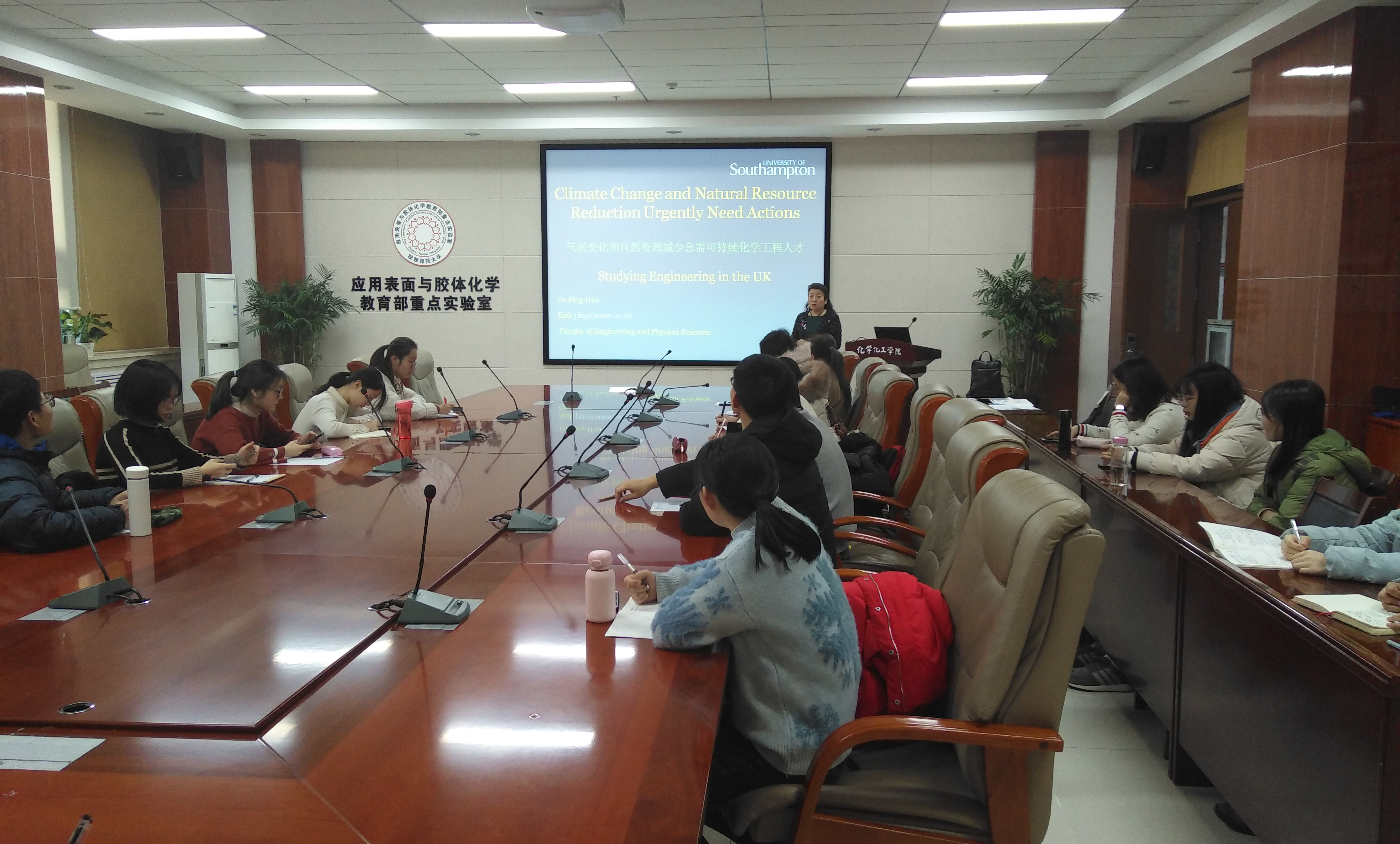 Hua Ping研究员以英国工业发展史为切入点,说明气候变化和自然资源的减少急需化学工程类人才;然后概述了当今英国工程类专业的划分及工程技术发展情况,介绍了英国工程专业学位授予情况及学位结构情况;之后详细阐述了英国南安普顿大学的工程专业及特色,实验室先进设备,以及南安普顿大学在欧洲范围及世界范围的排名情况;最后Hua Ping研究员欢迎大家选择英国南安普顿大学继续学习深造,并向同学们简要介绍了入学条件。