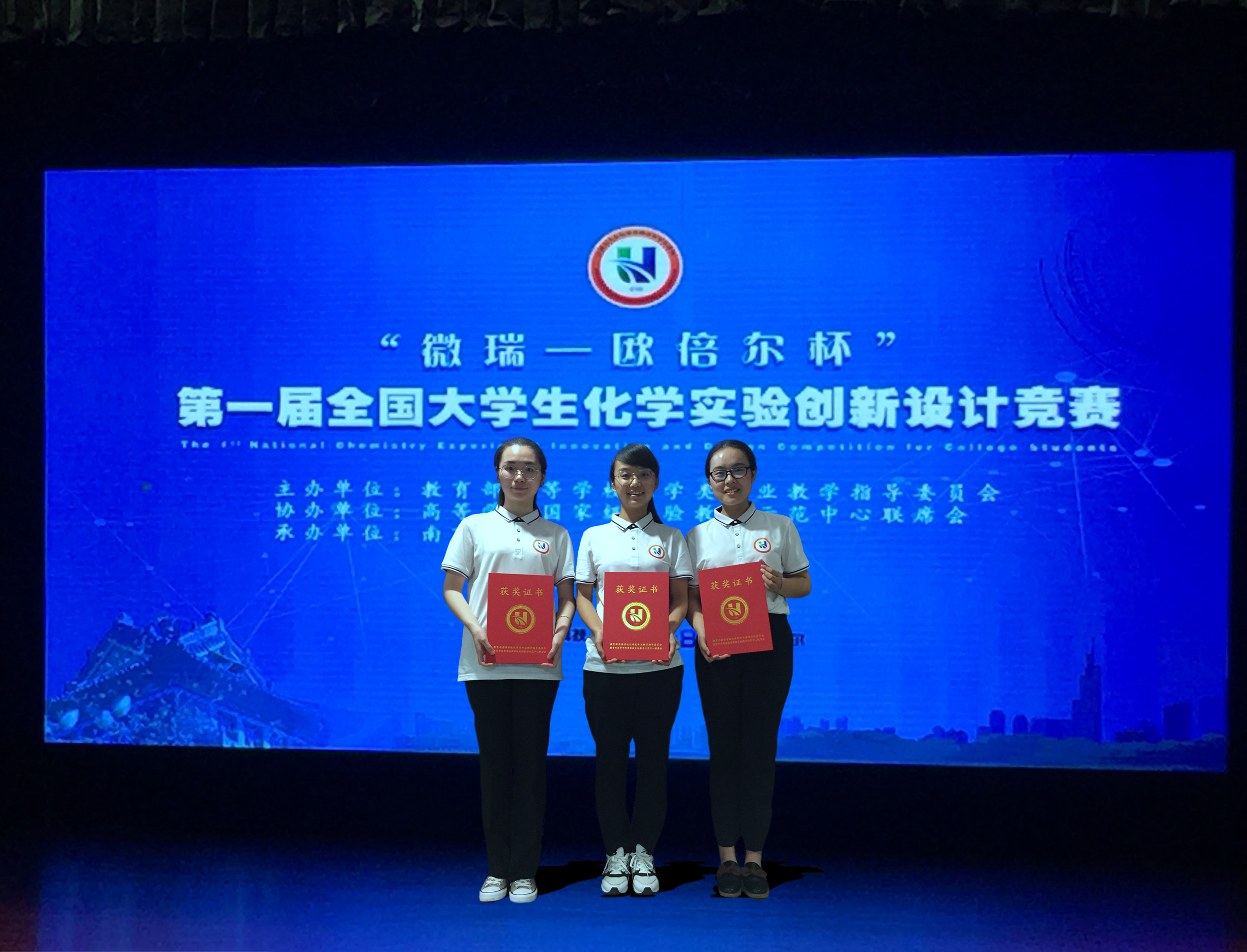 国家级化学实验教学示范中心的大力支持下,自5月份接到竞赛第一轮通知后,参赛选手在理论知识和实验技能考核选拔、查阅材料整理汇总、实验操作培训、到后期实验拓展应用等各环节都进行了认真准备。为了满足将关联新知识、新理论、新技术、新方法的科研成果设计并转化为适合本科生实验教学的素材的要求,参赛团队经过多次研讨确定了“暖白光LED用氟化物红色发光材料的制备及性能研究”作为竞赛课题,设计了该选题的实验教学过程,整理出了参赛论文。为了获得高品质的视频录像材料,三位参赛选手针对实验过程中的每一个细节和操作都进行了反复练习,与指导教师分析探讨了实验的关键步骤和重要原理,为后期答辩工作的顺利进行打下了坚实的基础。期间,何晓明教授多次为实验视频准备和录制工作提供了实验场地和实验器材。经过近五个月的磨练,三位选手凭借出色表现,不负重任,在答辩和提问环节展示出了扎实的理论知识和出众的创新思维能力,获得了评审专家的一致认可,顺利晋级第二轮答辩,最终获得了一等奖的优异成绩。