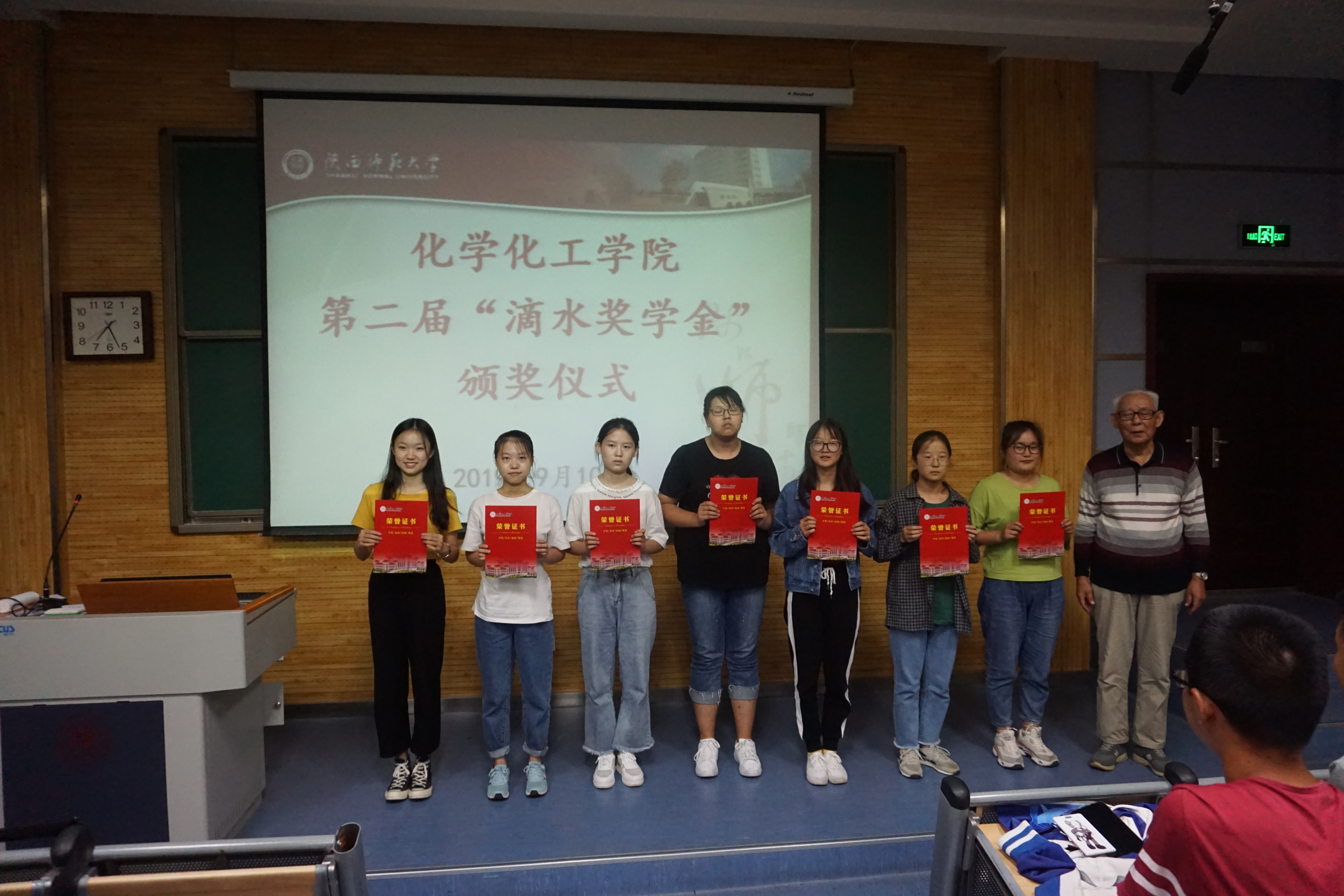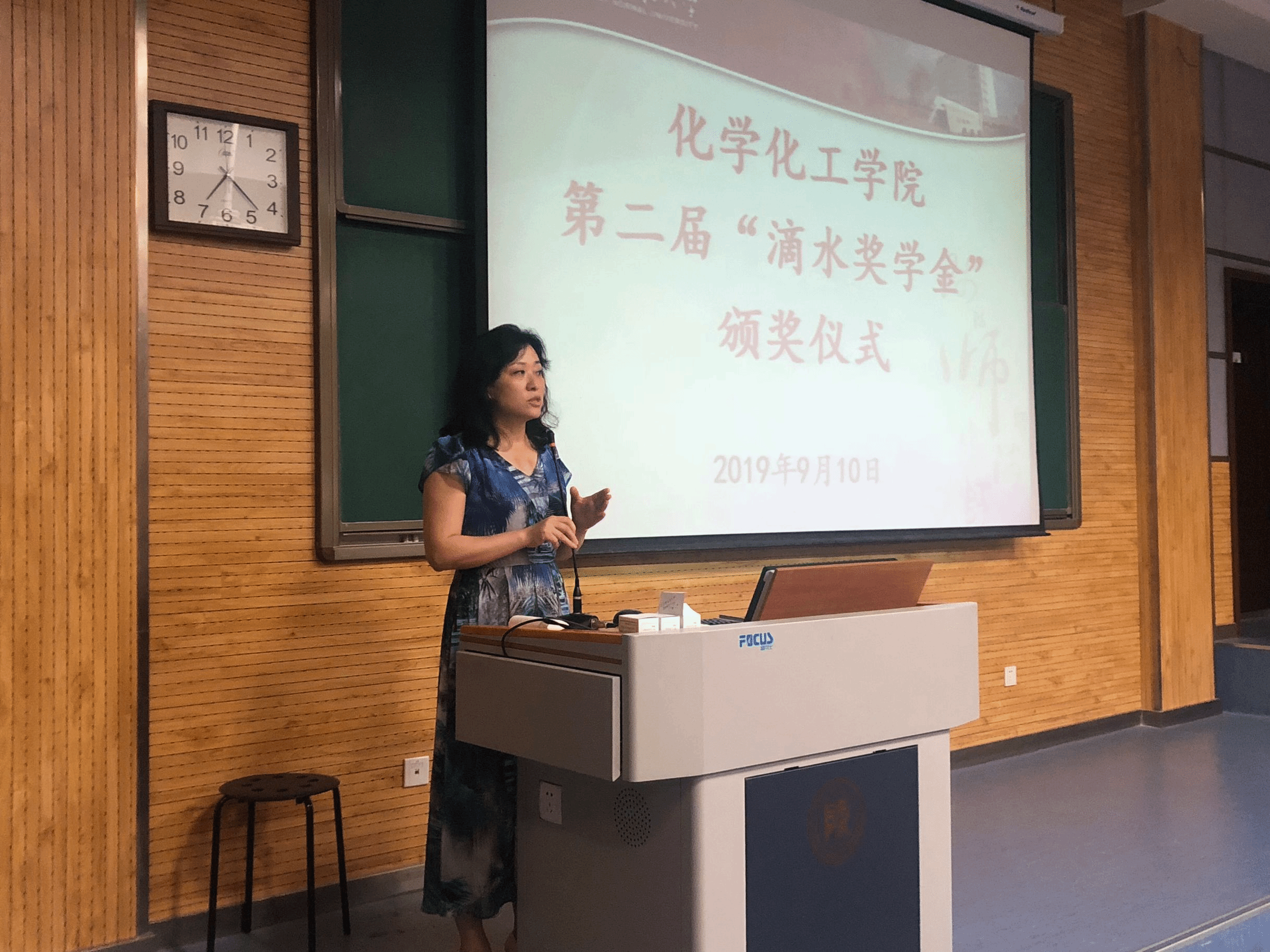 第二届“滴水奖学金”颁奖仪式在雁塔校区教学五楼5204教室举行。“滴水奖学金”捐资发起人、学院退休教师薛封和老师,学院党委书记高玲香、党委副书记王晓、分析化学教研室主任漆红兰、教工分析化学党支部书记刘伟、2018级辅导员翁思洁、2019级辅导员邓文珺以及学生代表参加了颁奖仪式。颁奖仪式由学院副书记王晓主持。