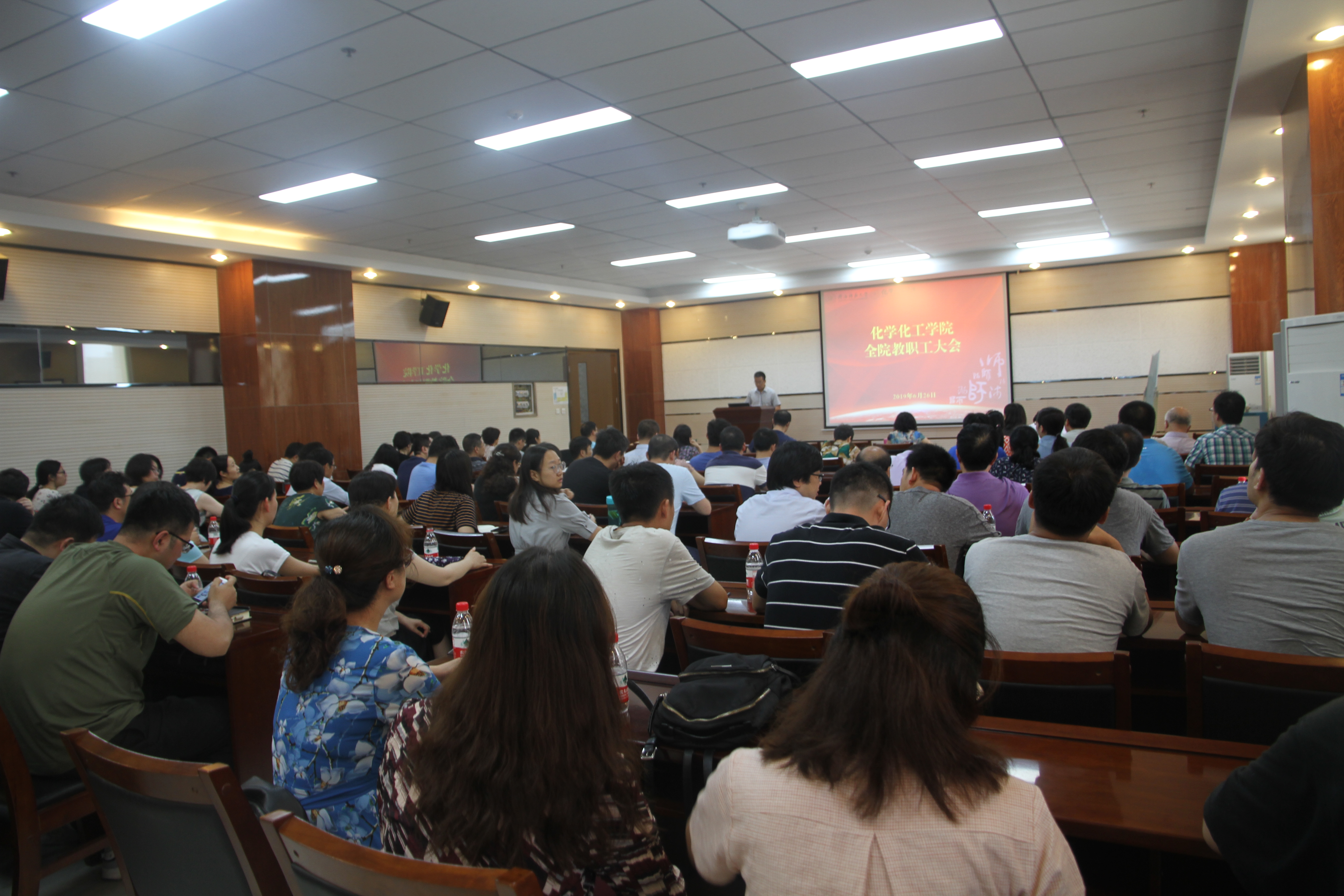 在致知楼六层报告厅召开全院教职工大会。学院全体教师,党政领导、学院办公室、学工组办公室以及实验中心办公室人员参加了会议。会议由学院行政副院长肖新军主持。