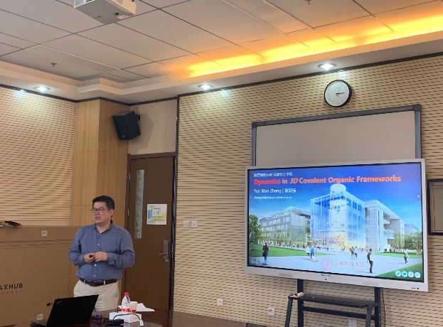 5月31日下午,上海科技大学章跃标教授应邀访问蘑菇视频 ,并在致知楼1362报告厅为蘑菇视频 师生带来了“Dynamic 3D Covalent Organic Frameworks”的学术报告。蘑菇视频 白俊峰教授、翟全国教授、赵玉明教授、徐玲副教授、薛东旭副教授等教师以及蘑菇视频 相关专业研究生和本科生聆听了此次报告。报告会由薛东旭副教授主持。