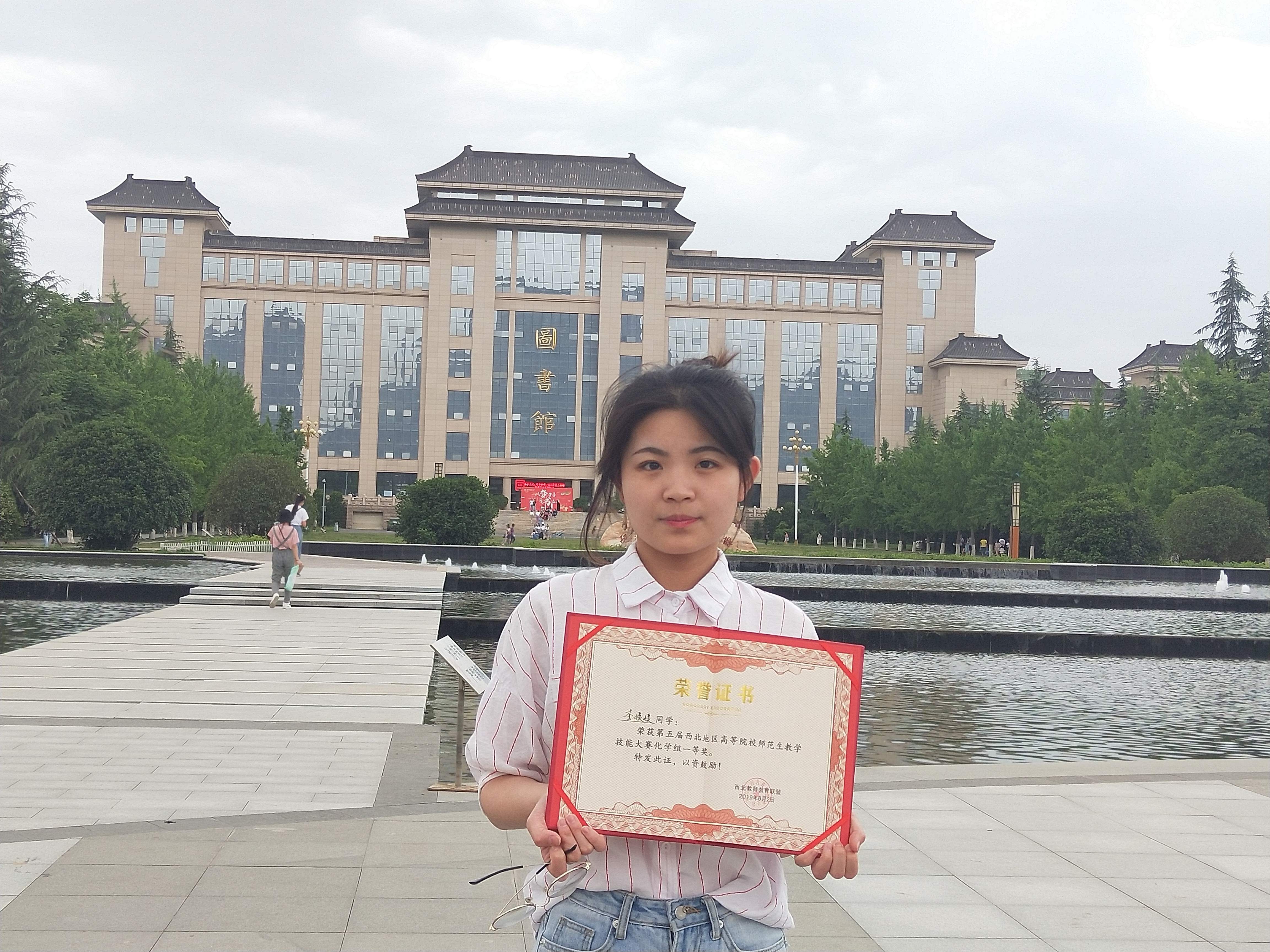 参加此项赛事的2016级化学1班李媛媛同学获得了一等奖的好成绩,薛亮老师被评为优秀指导教师。