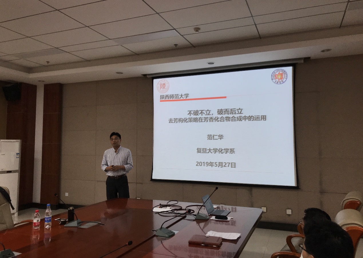 2019年5月27日下午,复旦大学范仁华教授应邀访问蘑菇视频 ,在致知楼1568报告厅为蘑菇视频 师生作了题为“不破不立,破而后立:去芳构化策略在芳香化合物转化中的一些运用”的报告。新疆大学刘晨江教授,蘑菇视频 段伟良教授、李超群教授、黄治炎副教授、汤卫军副教授、杨明瑜副研究员、李刚博士等教师及相关专业研究生、本科生聆听报告。报告会由王超教授主持。