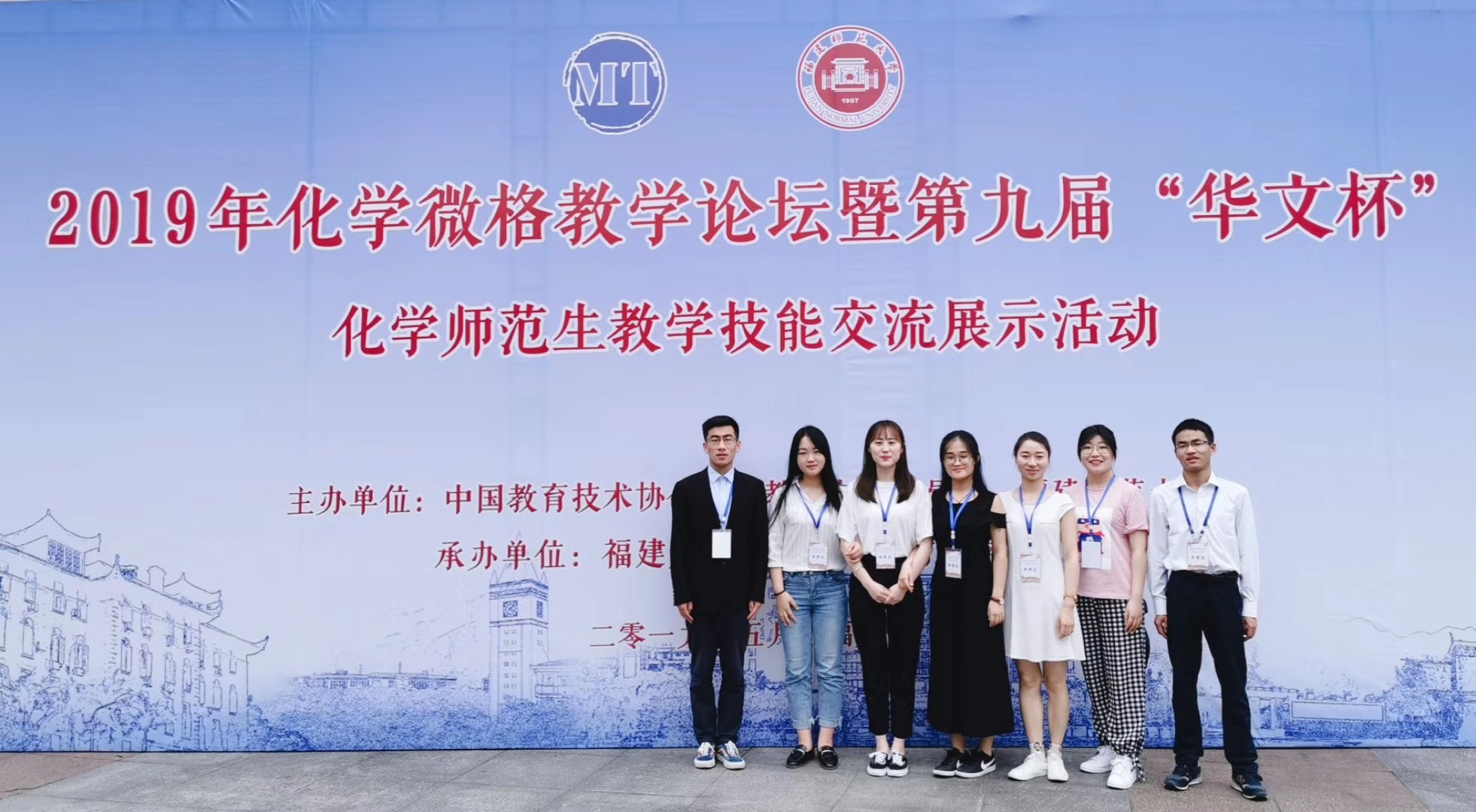 2019年5月17日-20日,2019年化学微格教学论坛暨第九届“华文杯”化学师范生教学技能交流展示活动在福建师范大学举行。本届赛事是由中国教育技术协会微格教学专业委员会、福建师范大学联合主办,本次大赛共有来自全国95所院校,共计478名学生参赛。经过教学设计、说课、模拟授课和现场提问等4个环节的激烈角逐,代表我校参加此项赛事的7名选手,都取得了优异成绩。其中,在教学设计的评奖中,崔文孝、胡旭亮荣获一等奖,温晨舒、张瑶、唐甜荣获二等奖,张歆翊荣获三等奖。在教学技能评奖中,崔文孝、唐甜荣获一等奖,张旭、温晨舒、张瑶、胡旭亮荣获二等奖,张歆翊荣获三等奖。