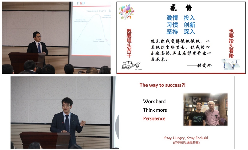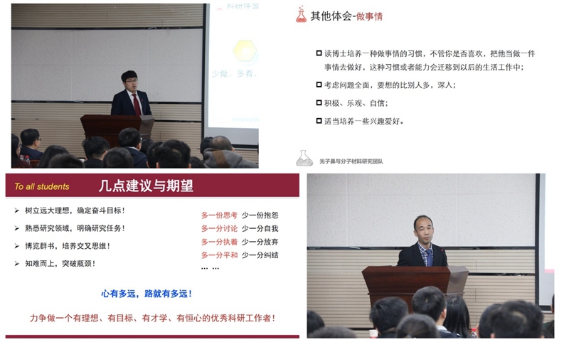 本次活动由丁立平教授主持,团队教师刘凯强博士以及三位博士生常兴茂、刘科、祁彦宇向参会人员分享了他们科研路上的心得体会,以及在高水平期刊发表成果的经验。首先,三位博士生分别介绍了他们攻读博士学位的经历和感悟,获得的成功经验和失败的教训,以亲身体会为低年级同学提出几点忠告:既要埋头苦干,也要抬头看路;科研需要激情、坚持、投入及创新;多思考,多交流,培养好的习惯;多出去看看,早日打开思路,要好学若饥,谦卑若愚。最后,刘凯强老师向大家分享了其研究思路及Advanced Materials投稿接收经验,并向在座学生提出几点建议和期望:心有多远,路就有多远,力争做一个有理想、有目标、有才学、有恒心的优秀科研工作者!