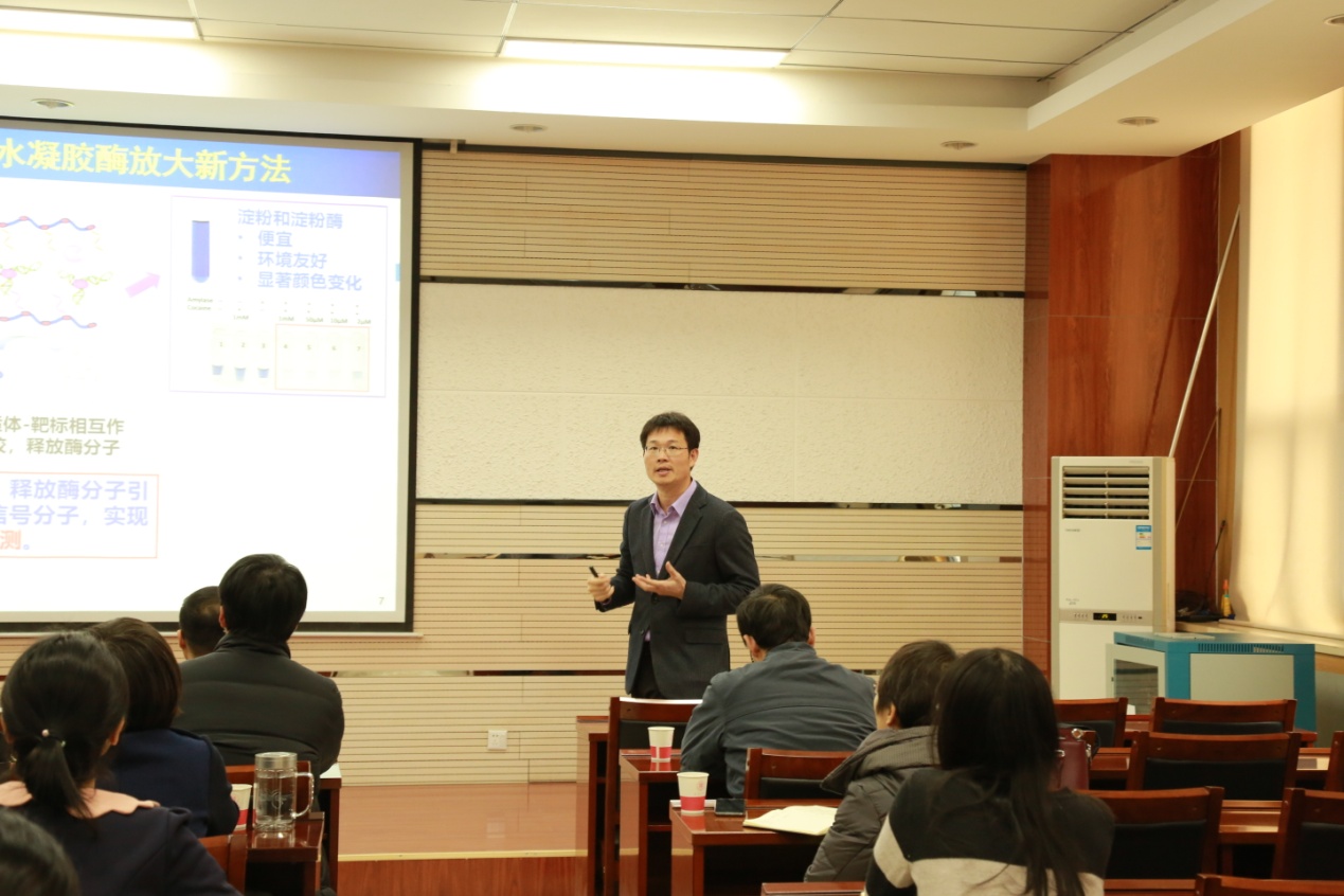 杨朝勇教授详细地介绍了其课题组近年来的工作成果,主要围绕即时检测(如何建立特异,灵敏,简单,便捷的即时检测方法)、液体活检(基于微流控芯片的疾病筛查新技术)、单细胞分析三个方面的研究工作进行了精彩的讲解。报告会后,蘑菇视频 师生与杨朝勇教授作了进一步的探讨与交流,提问环节现场气氛热烈,此次报告会使蘑菇视频 师生受益匪浅。