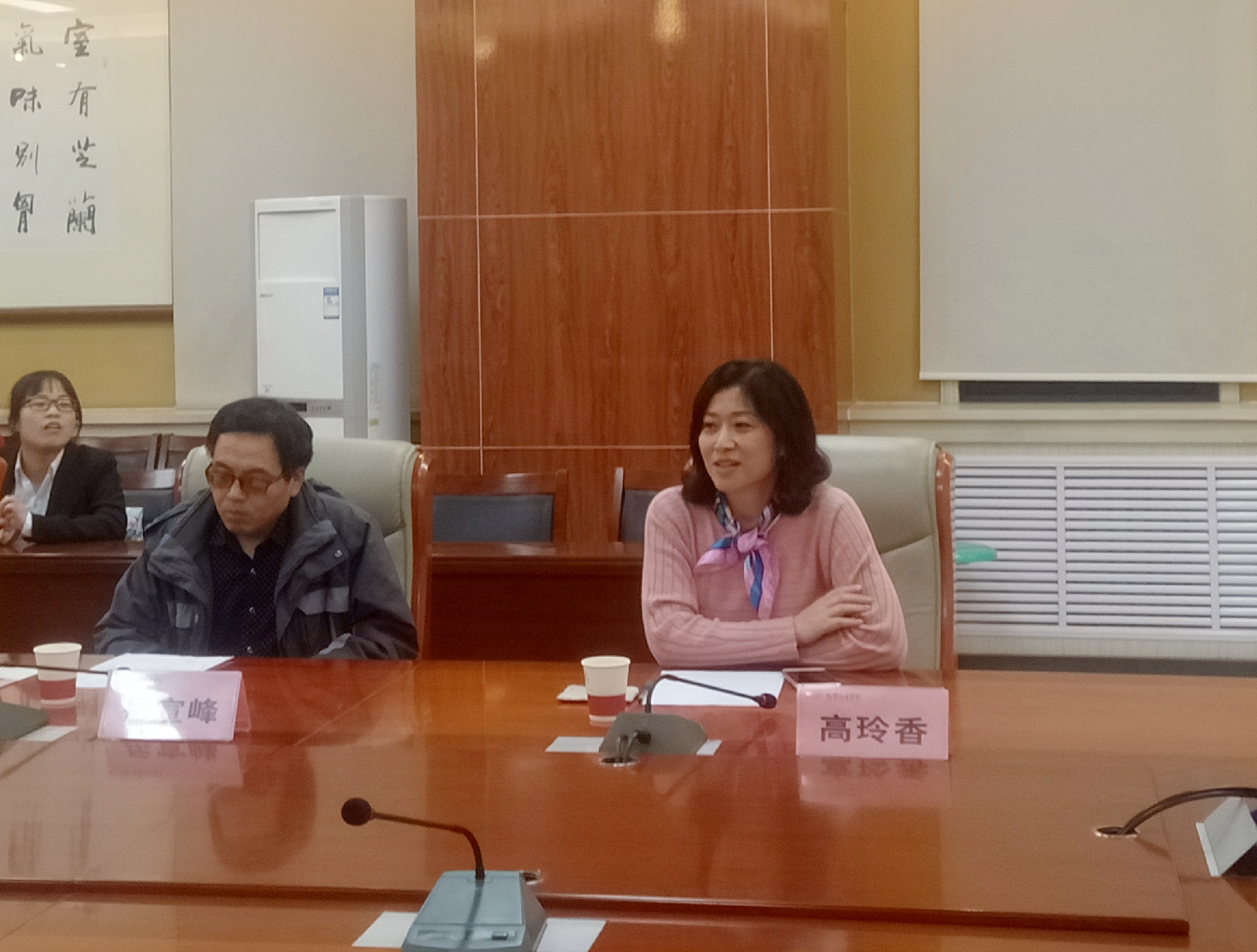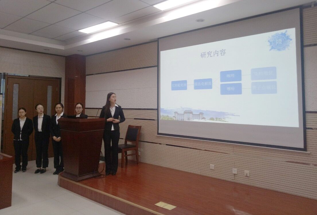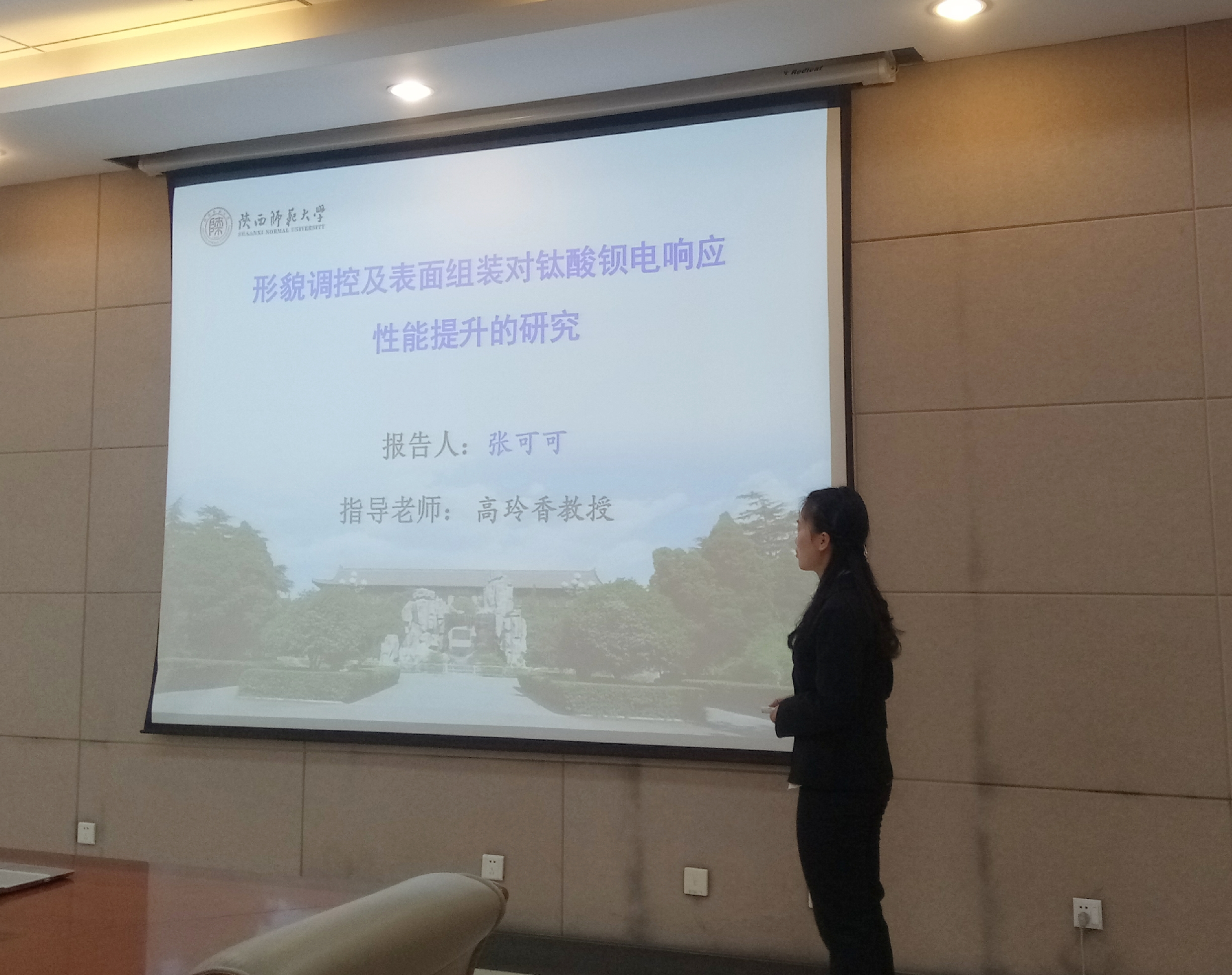在项目汇报过程中,张可可同学的实验课题是《不同形貌钛酸钡/氧化石墨复合材料的制备及其电响应性能研究》,她介绍了不同形貌BaTiO3的制备,并分享了自己的实验心得。苗荣老师和高玲香老师分别针对其答辩提出了自己的看法和疑问。