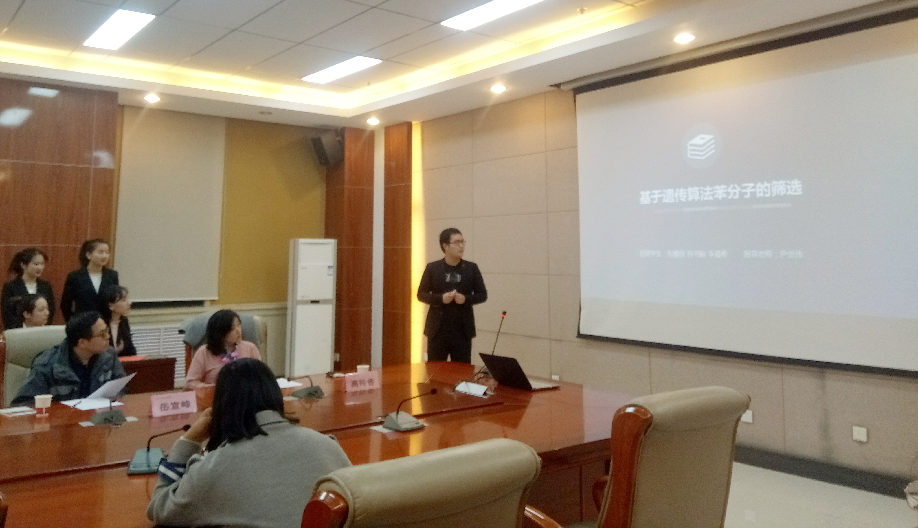 接下来,孙书航同学的课题是《基于遗传算法苯分子的筛选》,他对自己项目的研究背景、研究内容及后期计划作了详尽的介绍。张志琪老师建议将课题名称详细化,其总体的汇报内容也得到了四位老师的肯定。
