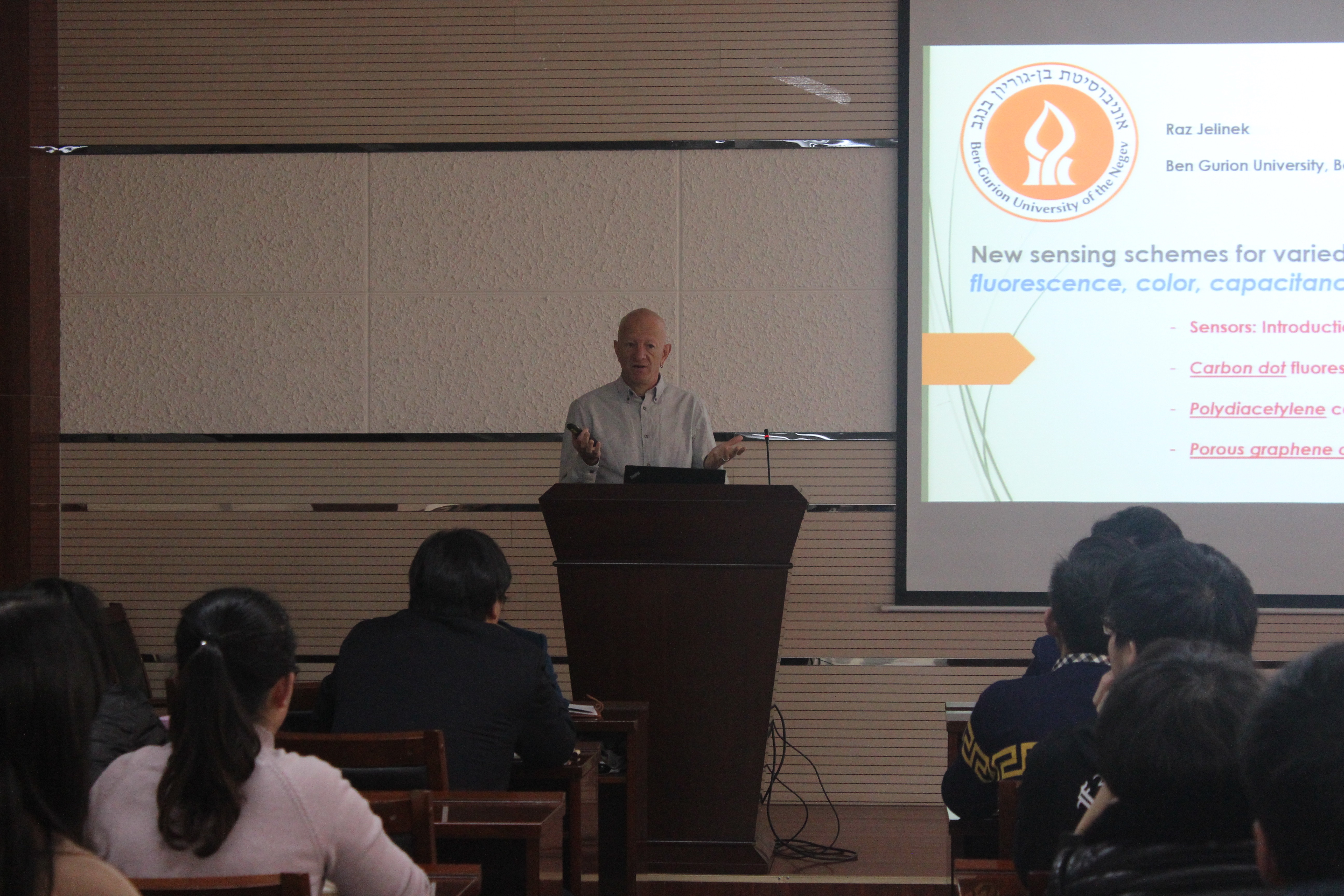 师生介绍了传感器的发展历程及其广阔的应用市场前景,随后他分别介绍了碳点荧光化学传感器、聚二乙炔颜色传感器和多孔石墨烯氧化物气体传感器等研究内容。报告结束后,Raz Jelinek教授与在座师生就相关学术问题进行了热烈讨论,此次报告使蘑菇视频