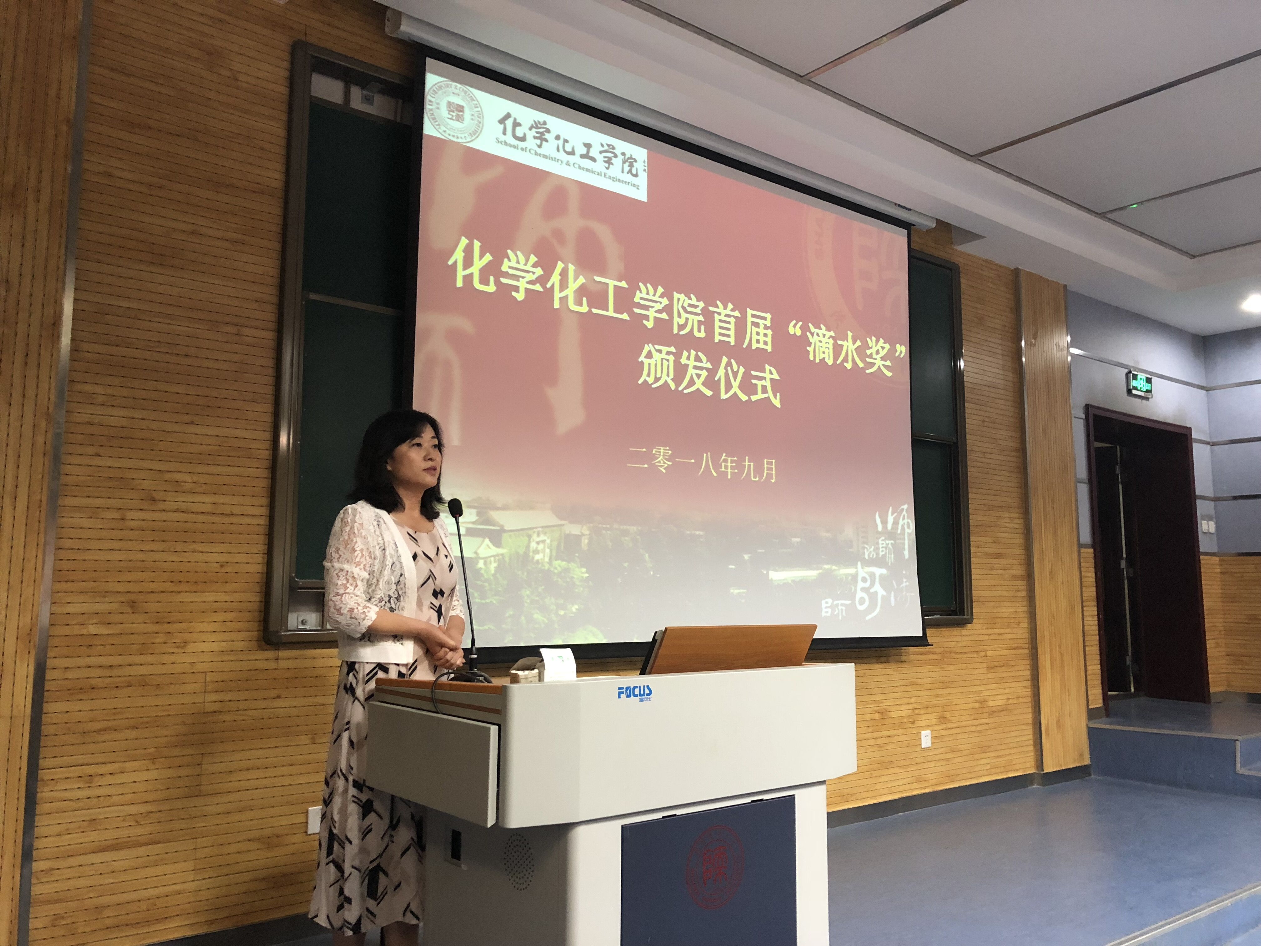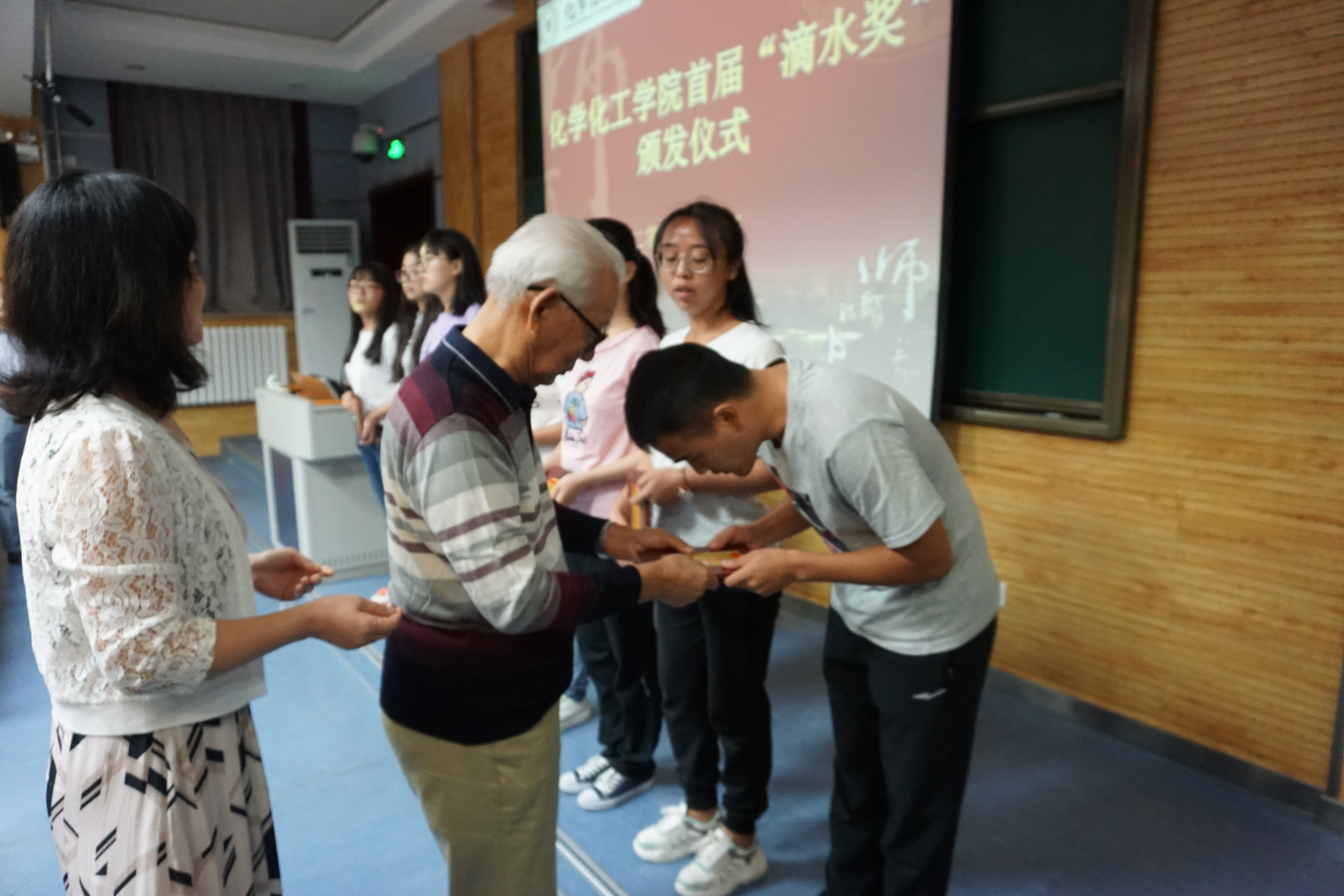 首届“滴水”奖学金颁发仪式在雁塔校区教学五楼5104教室举行。“滴水”奖学金捐资发起人、学院退休教师薛封和老师,学院党委书记高玲香、副书记王晓、分析化学教研室主任漆红兰、教工分析化学党支部书记刘伟、2017级学生辅导员龙卓华及年级全体学生参加了颁奖仪式。颁奖仪式由学院副书记王晓主持。