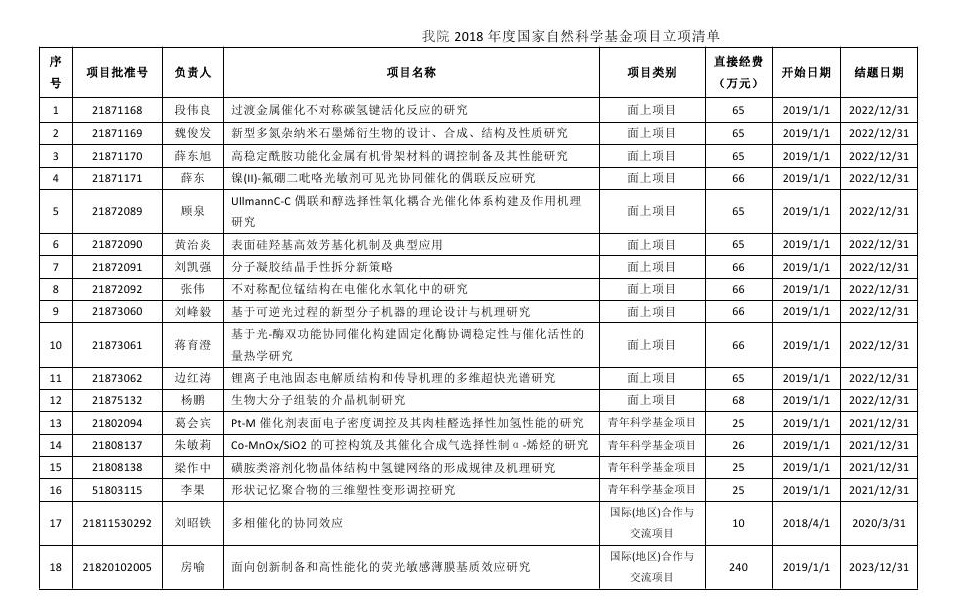 本年度国家自然科学基金立项资助项目18项,其中面上项目12项、青年科学基金项目4项、国际(地区)合作与交流项目2项(含1项重点项目),共获直接费用1139万元。