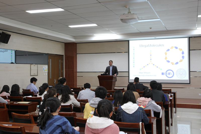 Mrksich教授主要从事于化学、材料和生物学三学科交叉领域的研究,着重强调应用于化学生物学和生物分析科学材料的设计和制备研究。在本次报告中,Mrksich教授给我们带来了全新的概念“宏蛋白分子”。他首先阐述了目前蛋白质合成所存在的问题,以及采用化学方法来解决蛋白质合成所存在的局限性:低效率和低选择性。Mrksich教授课题组则通过利用角质酶反应性与不同几何构型的连接体反应来设计合成具有链状、环形等形状的新型“宏蛋白分子”,该方法易于设计控制和功能化,反应速度快。Mrksich教授通过具体的实验方法与数据为我们进行了详细的讲解,通俗易懂,整场报告气氛活跃。会后,Mrksich教授与在座师生就相关学术问题进行了热烈讨论,此次报告蘑菇视频