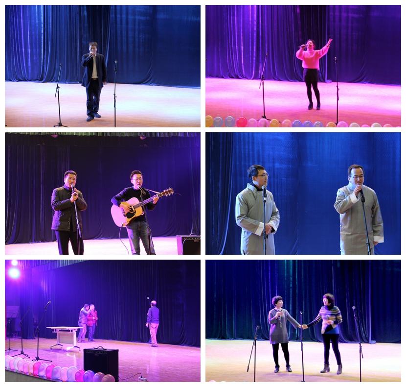 联欢会在和谐欢快的合唱歌曲《同一首歌》中拉开帷幕。整场联欢会内容丰富,形式多样,精彩纷呈;各工会小组的老师们纷纷登台,一展身手。吉他弹唱《冬季校园》、自编自演的相声《名字》、魔术表演、诗歌朗诵《父亲》以及歌曲合唱、歌曲串烧等节目接连上演,赢得了台下观众的阵阵掌声;中间穿插的游戏《微信摇一摇》、《五毛和一块》、《凑东西》使整个联欢会的气氛逐渐达到高潮;最后,联欢会在游戏《微信抽奖》中落下帷幕。