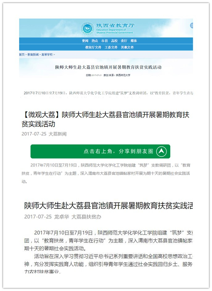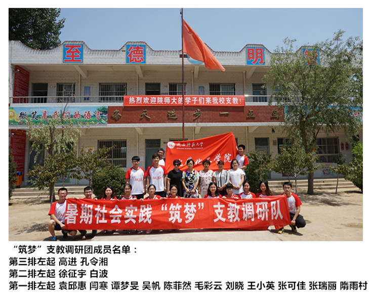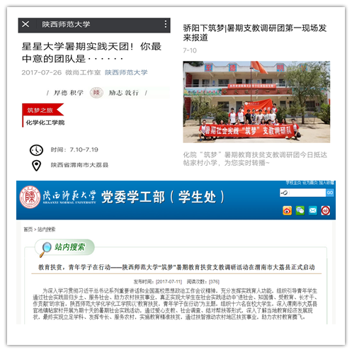 2017年7月,学院团委面向全体本科生招募选拔15名学生,组建“筑梦”支教调研团,以“教育扶贫,青年学生在行动”为主题,深入陕西渭南大荔县官池镇帖家村开展了为期十天的暑期社会实践活动。实践团通过爱心支教、结对帮扶、社会调查、文艺汇演等形式,深入了解当地教育经济发展现状,推动农村地区扶贫事业,助力农村教育发展。实践团成员经过基层调研和深入思考,围绕乡村基础教育、留守儿童成长、精准扶贫、农村经济发展等问题,共撰写了调研报告两篇、公开发表论文两篇、提交心得体会15篇、完成实践成果集一本、制作宣传视频一部。