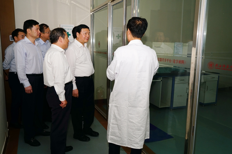 化学实验中心副主任杨文玉对大型仪器共享平台使用情况、平台在人才培养及社会服务等方面所发挥作用的工作汇报,现场观看了平台自主开发的大型仪器管理系统及学生仪器预约使用情况。娄勤俭肯定了平台在仪器共享中所做的工作,特别是对教师把个人专用仪器放在平台共享以及全院教师出资购置大型仪器的做法表示赞赏。他希望平台进一步扩大对外服务范围,为陕西经济发展和资源共享做出贡献。