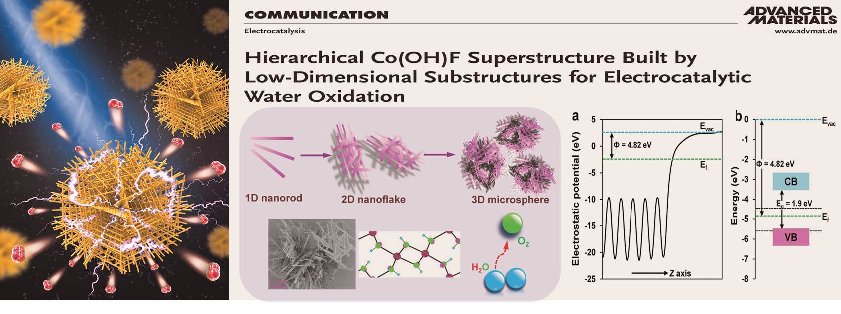 基于前期的系列结果,团队研究人员在开发用于电催化水氧化的新材料与新结构方面进行了大量尝试,并于近期成功合成了新颖的Co(OH)F多级结构材料。该材料是一种新奇的多级组装体系。其基本结构单元为单晶纳米棒,其次级结构为由纳米棒编织而成的多孔纳米片层结构,其高级结构为由纳米片层结构搭建而成的独立微球聚集体超级结构。这种新颖的材料组装形式导致最终结构中同时包含了一维、二维和三维材料特性,这些多维特性在催化过程中均起到明显的积极作用。一维基本单元的各向异性特性带来快速的电荷转移能力、高比例的低能晶面和超高表面积体积比率;一维结构编织的二维单元带来催化过程中快速的传质与传荷;三维超级结构的高孔隙率可以极大提升底物扩散效率。同时,Co(OH)F也是首次被报导为电催化水氧化催化剂。惰性氟配体的引入不仅形成了新颖的组装结构并很好的稳定了催化剂表面结构。电化学及理论计算表明在催化水氧化前表面二价钴被逐步氧化成高价态活性钴中心。该论文的第一作者为蘑菇视频
