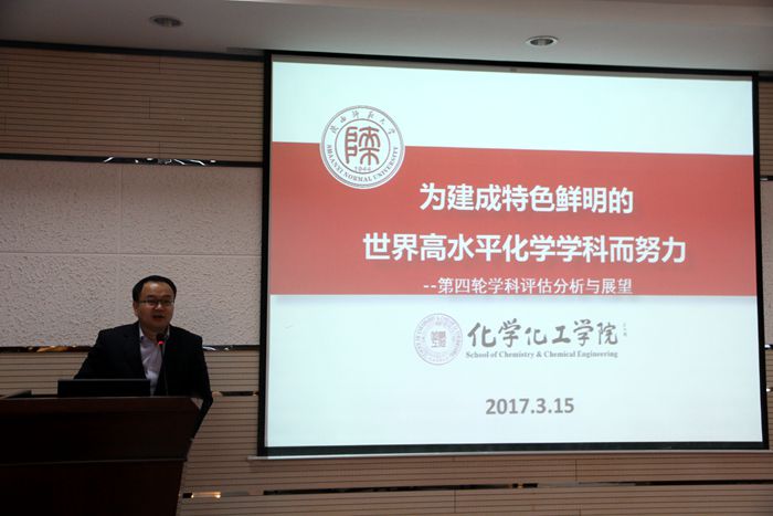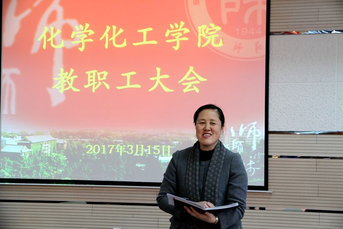 现状进行了深刻剖析。他要求全院教职员工以“团结、稳定、追赶、超越”为指导思想,立足西部,放眼全国,以一流高校为目标,撸起袖子加油干,为建成特色鲜明的世界高水平化学学科而努力。薛东提出学院本学期的三项重点工作:一、更加重视人才培养质量提升。把人才培养作为学院的重点工作来抓,加强人才培养质量的管理和培养;二、更加重视人才引进和教师成长工作。既要重视青年人才成长,同时也要重视现有教师的发展,将新教师引进工作和现有教师培养工作同时推进;三、全面提升科学研究成果转化及服务社会的水平和能力。加强学院科研平台的应用化建设,在现有研究的基础上,对可进行转化的项目进行重点孵育,实现产学研结合。