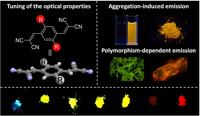 “生物正交与小分子探针”研究团队的赵娜、李楠副教授与香港科技大学唐本忠院士合作,通过在2,2-二氰基乙烯基苯的2,5位引入具有不同电子和位阻效应的非芳基和芳基作为电子给体,获得了两个系列具有光谱可调谐的固体荧光材料。对分子发光行为以及晶体堆积方式的系统深入研究表明:当取代基为非芳基时,整个分子的构型趋近平面化,分子间具有较强的π-π相互作用,导致其固态发光效率降低;而芳基取代基的引入能够使分子具有高度扭曲的构型,从而有效避免了分子间π-π相互作用的产生,使其具有较高的固态发光效率和独特的聚集诱导发光(AIE)性质。该体系中的一些AIE分子还表现出独特的同质多晶现象和压致变色行为。这一研究结果为设计合成新型的有机固体发光材料提供了新的思路,该类结构简单的发光材料还有望应用于生物标记领域。
