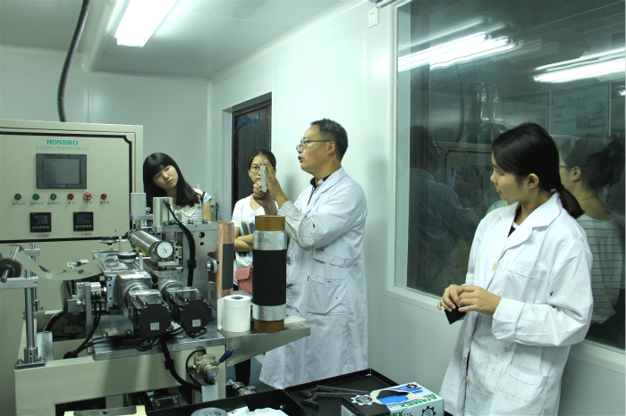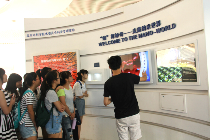 活动第三站——中国科学院国家纳米科学中心。在苗力孝副研究员的引领下,同学们参观了我国纳米科学基础研究和应用基础研究的硅谷——国家纳米科学中心。苗老师用风趣的语言、通俗的文字给同学们介绍了锂电池的设计制作原理、充放电核心技术等,并一一展示了制作高精密度、高性能锂电池的尖端技术与加工设备。随后,在纳米所的科普知识展示大厅中,工作人员给同学们介绍了纳米材料的概念和原理、现有的应用技术和未来发展方向,并且对研发制作纳米材料所需的仪器及技术进行了讲解。笃学班的同学们也充分利用这一机会,结合自身所学,积极向老师们请教。参观结束,纳米中心的工作人员给同学们赠送了科普书籍与光盘供同学们进一步学习。