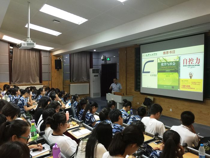 薛东教授首先向同学们全景展示了学院人才培养方面优良的软硬件条件,并对学院教师的教学科研情况进行了全面介绍,让同学们对未来的课程学习与科研实践充满了期待。报告中,薛东教授回顾了自己的求学生涯,以切身经历告诫同学们,不论是在学习中还是生活上都需要坚持梦想,敢于拼搏,不断地挑战自我。随后,薛东教授又从甲午战争留下的思考讲到民族复兴的希望,引出科技创新的重要性,从爱国角度激发了同学们为中华民族崛起而读书的激情。薛老师还通过数名优秀院友的成长故事,激励同学们要立志高远,追求卓越,争做学历高、知识丰富、气质高雅的“高富雅”。薛老师勉励同学们,要明确自身的人生方向,不盲目跟风,不人云亦云,因为一个人只有想清楚了自己的方向时,才有拼搏的动力。他鼓励同学们把人生目标细化,让一个个小目标铺就通往成功的康庄大道。讲座最后,薛东教授还向同学们推荐了《化学简史》、《化学与社会》、《自控力》三本书籍,勉励同学们读书以广识,积学以修身,用实际行动践行我校“抱道不曲,拥书自雄”的学风。