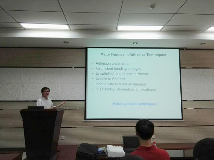报告中,钟超研究员详细介绍了其有关水下粘合材料的相关工作,即利用基因工程将两种蛋白质(一种具有表面粘合,另一种具有淀粉样纤维结构)有效结合构建的强水下粘合剂。另大家受益匪浅,报告后,老师和同学们结合自己的研究积极向钟超研究员提问并展开激烈的讨论。