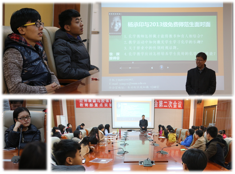 杨承印教授做客2013级化学1班教授接待日,杨承印教授首先和同学们分享了他自己的求学经历和工作历程,将自己的人生经历和感悟倾囊相授,同学们感受颇丰。杨承印教授就“化学教师怎样做才能将教书和育人相结合”谈了自己的理解,指出化学知识是用来“教育人、发展人” 的,中学教师应该在教学的过程中挖掘育人的道理,做到教书育人相结合;就“教学活动中如何激发学生学习化学的乐趣”,杨承印教授建议同学们要在教学过程中充分调动学生学习化学的兴趣,并列举了很多教学案例;杨承印教授还为女同学的就业支招,认为只要加强自身的综合素质的提高,应聘时用实力说话就能找到称心如意的工作,不要担心就业中“性别歧视”问题;在谈到“化学教学应该怎样培养学生良好的化学实验技能”这个问题时,杨老师强调中学化学实验对于中学老师和学生都非常的重要,只有让学生接触和体验化学实验,才能触发其对化学实验,对化学知识的兴趣,才能使化学“教育人、发展人”。最后,杨承印教授对同学们提的问题一一进行了解答,指出中学老师首先应该有强烈的责任心,同时应该结合教材和考试大纲落实好三维教学;对于教师的发展问题,杨教授指出毕业后的免费师范生与导师应该多多联系和交流,继续保持一颗渴求知识的心态,不断增强自己在教育学方面的能力,紧跟时代的步伐。
