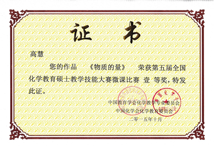 化学教育专业多位研究生获奖,高慧、毛永舜获得了第五届全国教育硕士教学技能大赛微课比赛一等奖,程思源、叶舒妍、刘欢、蒙文英、马育谷获二等奖,鲁春梅获三等奖。