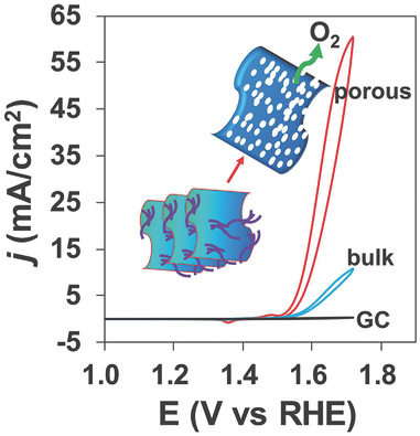 曹睿教授领导的分子模拟与太阳能转化研究团队采用新颖的模板合成方法得到了多孔的Ni-Fe氧化物高效水氧化催化剂。该方法通过大量前期筛选工作,寻找到了一种在较低温度下能被蒸发移除的有机模板剂。进而通过低温蒸发移除催化剂混合物前体里面的有机物模板剂来构筑多孔结构。由于采用了与传统高温煅烧移除模板剂不一样的方法,该新颖的方法使得生成的催化剂具有大的比表面积。相比室温形成的无定型催化剂而言,热处理不仅一定程度上提高了催化剂的稳定性,同时这一较低的合成温度还有利于使大量的Fe均匀掺杂到催化剂中来形成高效的Fe:NiO催化剂。而且,这一较低的合成温度不会导致生成在高温条件下很容易生成的低活性的铁酸盐结构。这一新颖的模板方法在合成热稳定性差、害怕高温处理的多孔材料方面有重要的研究前景。