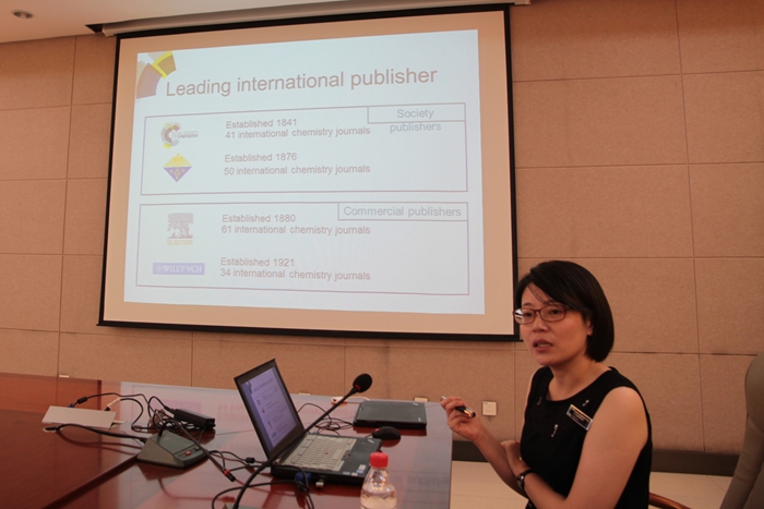 报告中,刘文君博士首先介绍了英国皇家化学会的基本情况,旗下主要期刊的杂志定位、影响力及出版服务等概况。随后,她着重介绍了RSC新创刊的两本杂志:Inorganic Chemistry Frontiers和Organic Chemistry Frontiers。这两本杂志分别由中国化学会、一所国内主要科研机构、RSC共同所有,主要发表化学二级学科的前沿研究工作。刘博士从文章选题、摘要撰写、如何投稿等方面与在场师生分享了她宝贵的经验,并期待我校师生能将优秀的研究工作发表在RSC旗下的期刊上。