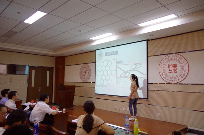 在项目汇报过程中,2012级刘娇同学讲解的《在烷基腈和醇类参与下未激活烯烃分子间的铜催化反应》,详细地介绍了他们所做实验的过程以及取得成果,获得了评委们的肯定;金美玲同学讲解的《具有三重对称结构的纳米石墨烯(c-HBC)的研究》,详细介绍了当今纳米石墨烯的合成情况,也描绘了他们团队的实验思路和创新点;史璐同学讲解的《西安室内氡浓度水平及人体辐射暴露研究》采用大量的实验数据,在不同季节,不同地点测量了氡的浓度,实验结果具有说服力,获得老师的一致好评;2013级张琳延同学的表现也是可圈可点,她主讲的《两亲性纳米石墨烯的合成及其在石墨烯剥离中的应用》通过简明的合成路线分析,让同学们清晰地了解了他们项目组进行科学探索的思路和创新点,获得了评委老师的肯定和鼓励。