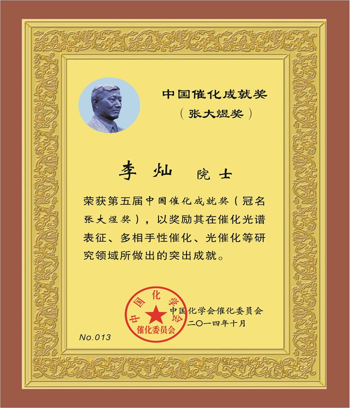 “中国催化奖”自2006年设立以来,每两年评选一次,包括“中国催化成就奖”(冠名张大煜奖)、“中国催化青年奖”和“中国催化新秀奖”。其中,“中国催化成就奖”是中国催化领域的最高学术奖励,在此之前已有四位院士获得此奖项。李灿院士是第五位获此殊荣的院士。