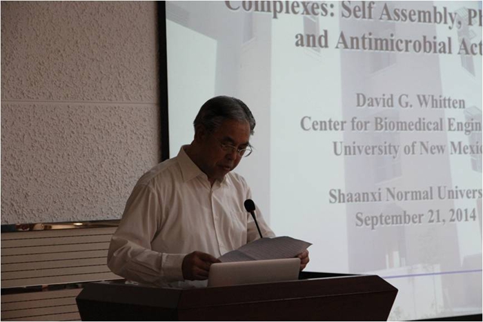 David Whitten教授主要介绍了其课题组近年来在共轭聚合物和寡聚物领域的研究工作,特别介绍了其小组所合成的一些特殊结构的OPE分子与表面活性剂的组装行为、光物理性质以及抗菌活性等方面的研究进展。其后,作为Langmuir杂志主编,Whitten教授又简单地介绍了投稿过程的注意事项以及一些写作技巧。报告后,蘑菇视频