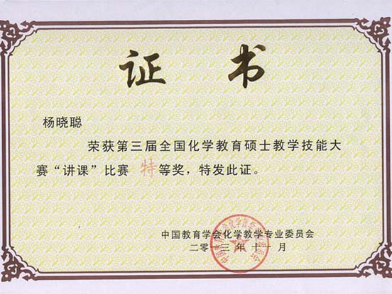 11月18日,在周青教授的带领下,杨晓聪、彭涛、赵舒昱等七位同学满怀信心地参加了在华中师范大学举办的“第三届全国化学教育硕士教学技能大赛”决赛,并取得了优异成绩。杨晓聪同学以骄人的成绩荣获特等奖,赵舒昱、彭涛、杨雪丽、胡婷婷、刘晶和董腊玲也取得了一等奖的好成绩。蘑菇视频