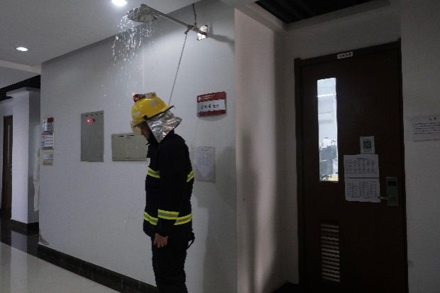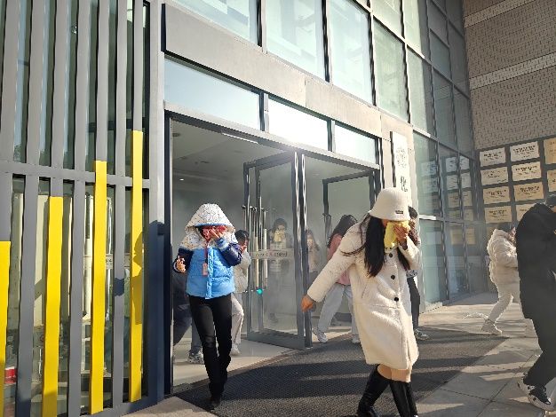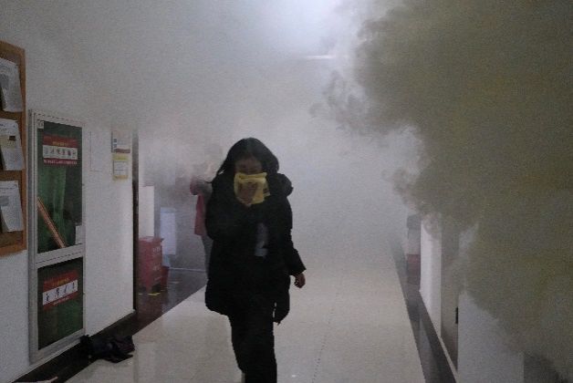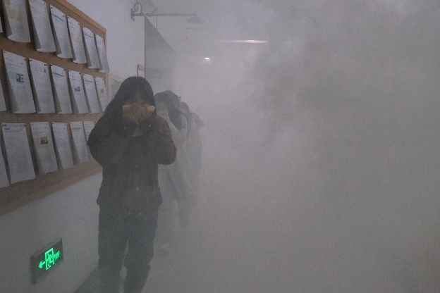 27日早上7:00开始,在致知楼一层南门通过二维码统计进入楼层所有人员数量,同时发放消防安全物资。9:15左右,在模拟火灾发生场景下,总指挥王长号发布应急疏散指令,各楼层点燃烟雾发生器和拉响警报信号,应急疏散环节迅即展开,各应急小组按照统一领导、综合协调、分级负责的应急处置原则迅速到达各自岗位,对照事故的发现与报告、应急指挥与协调、现场救援与疏散、事后检查与核查的演练流程,指挥师生员工打湿毛巾、捂住口鼻、低头弯腰、有序撤离。整个人员疏散过程演练用时4分40秒,共统计疏散人员886名。