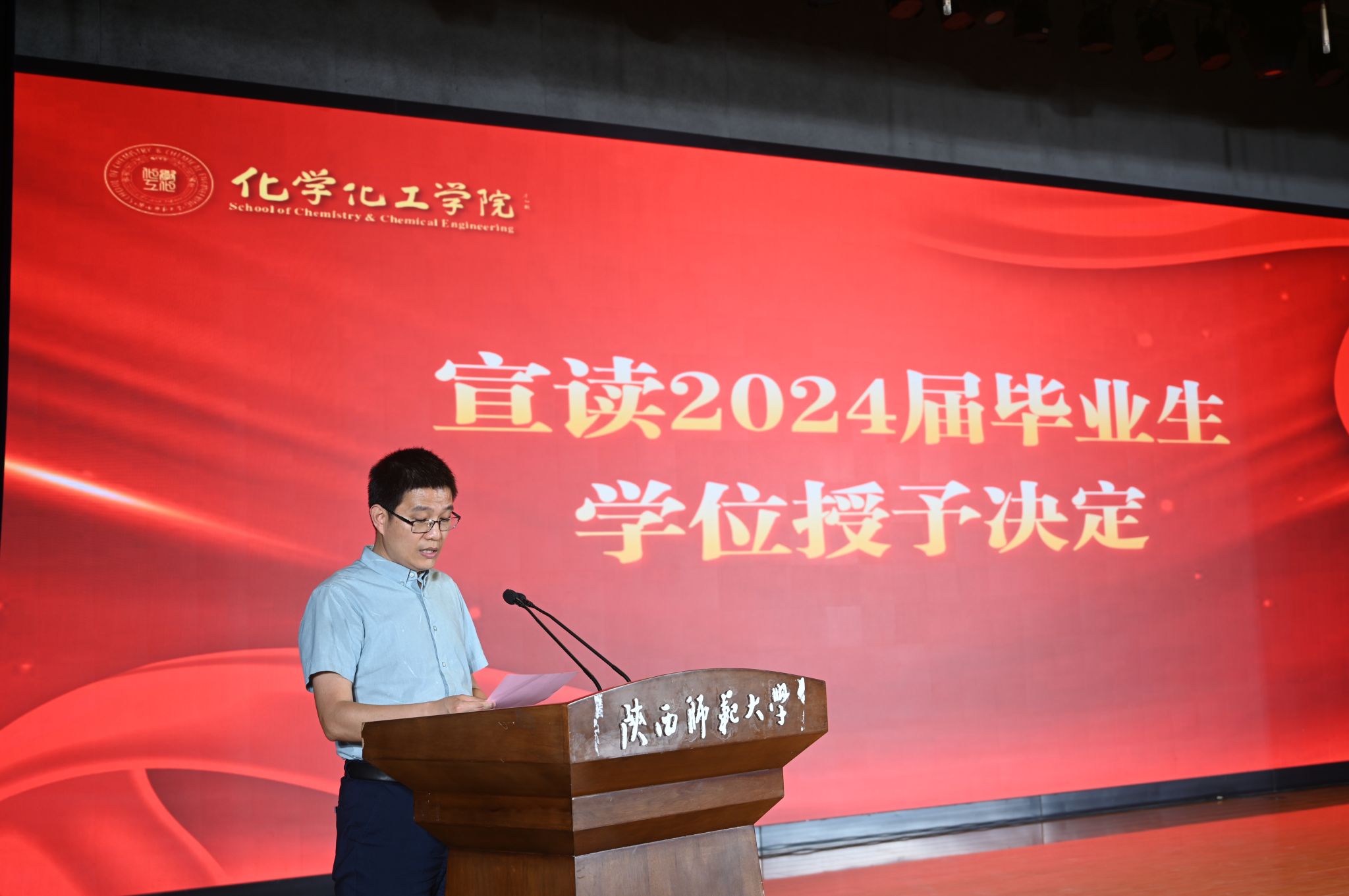 院长薛东教授代表学院向毕业生表达了诚挚的祝贺和美好的祝愿。临别之际,他向2024届毕业生提出三点希望:一是善用专业,做经世致用之人。共同努力讲好化学故事,让更多的人知化学、学化学、爱化学,让化学在推动社会发展和人类文明进步的事业中发挥重要作用。二是主动适应,做追求卓越之人。紧紧把握人工智能时代的历史机遇,迎接挑战,为中国的成功崛起做出自己应有的贡献。三是善待自己,善待家人,善待周围的人,做从容豁达之人。既能享受成功之时的把酒言欢,更能在失意之际保有“行到水穷处,坐看云起时”的智慧和洒脱。
